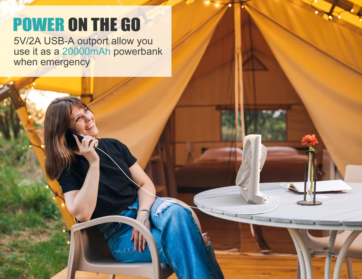 Q: Can I charge my phone using this fan?A: Yes, the fan features a 5V/2A output port that allows you to charge your phone, laptop, or other electronic devices.
