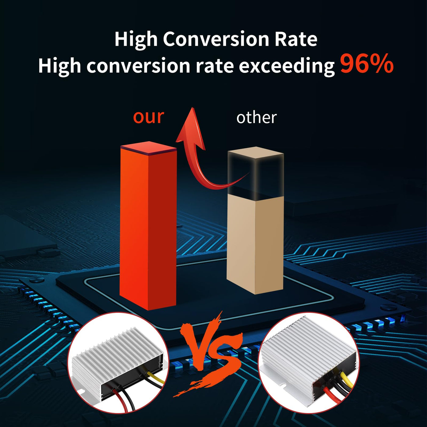 Q: What are the key features of this 24V to 12V step down converter?A: This converter features a compact design, IP67 waterproof rating, over-temperature protection at 150℃, and boasts over 96% conversion efficiency, making it suitable for outdoor use and reliable in various conditions.