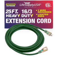 25 Ft Power Extension Cord Outdoor & Indoor Heavy Duty 16 Gauge/3 Prong Sjtw (Green) Lighted End Extra Durability 13 Amp 125 Vol