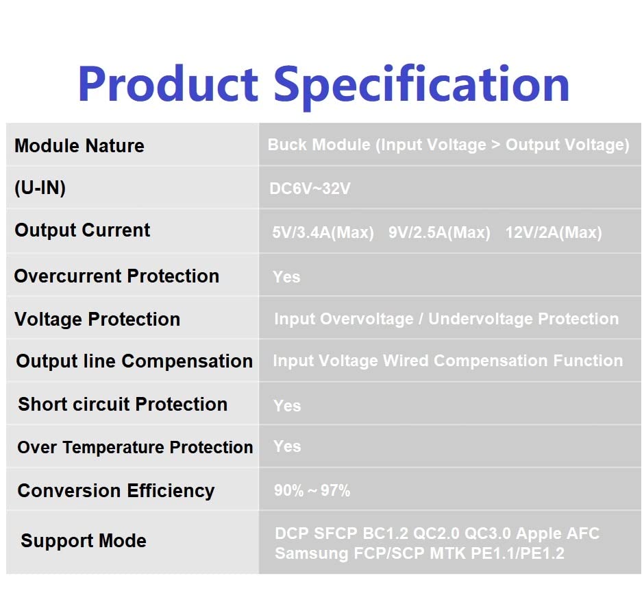 2 Pcs Qc2.0/3.0 Dc Converter Voltage,Aideepen 24W Quick Charge 6V-32Vto 5V Converter Dc Buck Converter Module Usb-A Dc To Dc Car Power Converter Adapter Qc3.0:Wide Voltage Input: 6V-32V, Output:Dc 5V+Qc3.0, Output Current: 3.4A; Output Power:24W(Max). Durable:This Dc To Dc Converter With Overcurrent Protection, Overvoltage Protection, Over Temperature Protection, Short Circuit Protection.With Stable And Sturdy Performance. Low Loss:This 12V To 5V Usb Adapter Integrates A Switch Thin Voltage Regulator Module, And The Conversion Rate Is Up To 96%. Fast Charging:It Saves You Time Waiting For Charging. Support Qc 3.0/2.0, Fcp, Sfc, Suitable For Gps Navigation, Driving Recorder, Car Audio, Mp3/ Mp4, Walkie Talkie, Surveillance System, Bus Display, Taxi Advertising Screen, Lcd Tv, Led Ect.
