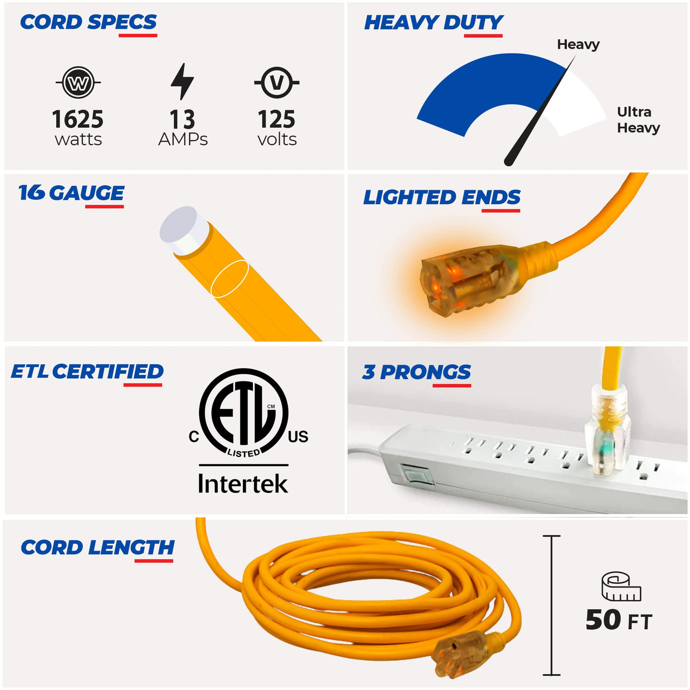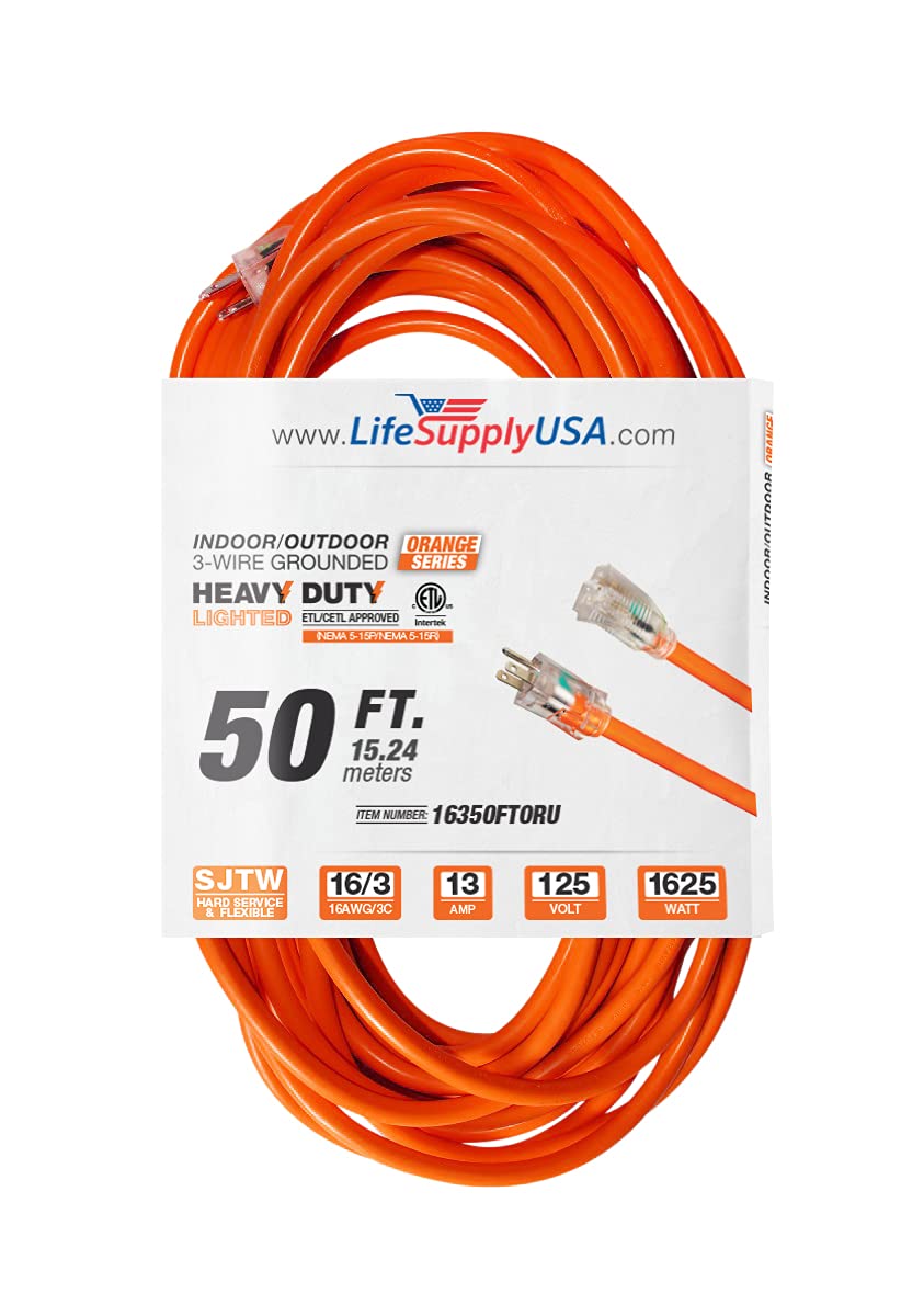50 Ft Power Extension Cord Outdoor & Indoor Heavy Duty 16 Gauge/3 Prong Sjtw (Orange) Lighted End Extra Durability 13 Amp 125 Vo