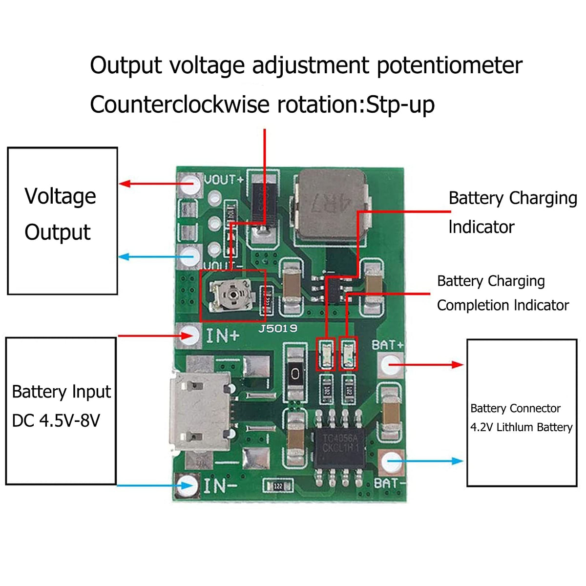 Technical Specifications: Charging Voltage: 4.2V Dc Charging Current: Max. 1A Discharging Current: Max. 2A The Output Current: 5V 1.4A/9V 0.8A/12V 0.6A Input Voltage: 4.5 - 8V Dc Output Voltage: 4.3 - 27V Dc (Continuously Adjustable) Size: 1.3 In X 0.92 In/33 Mm X 23 Mm Package Includes: 2 * Buck Converter Module