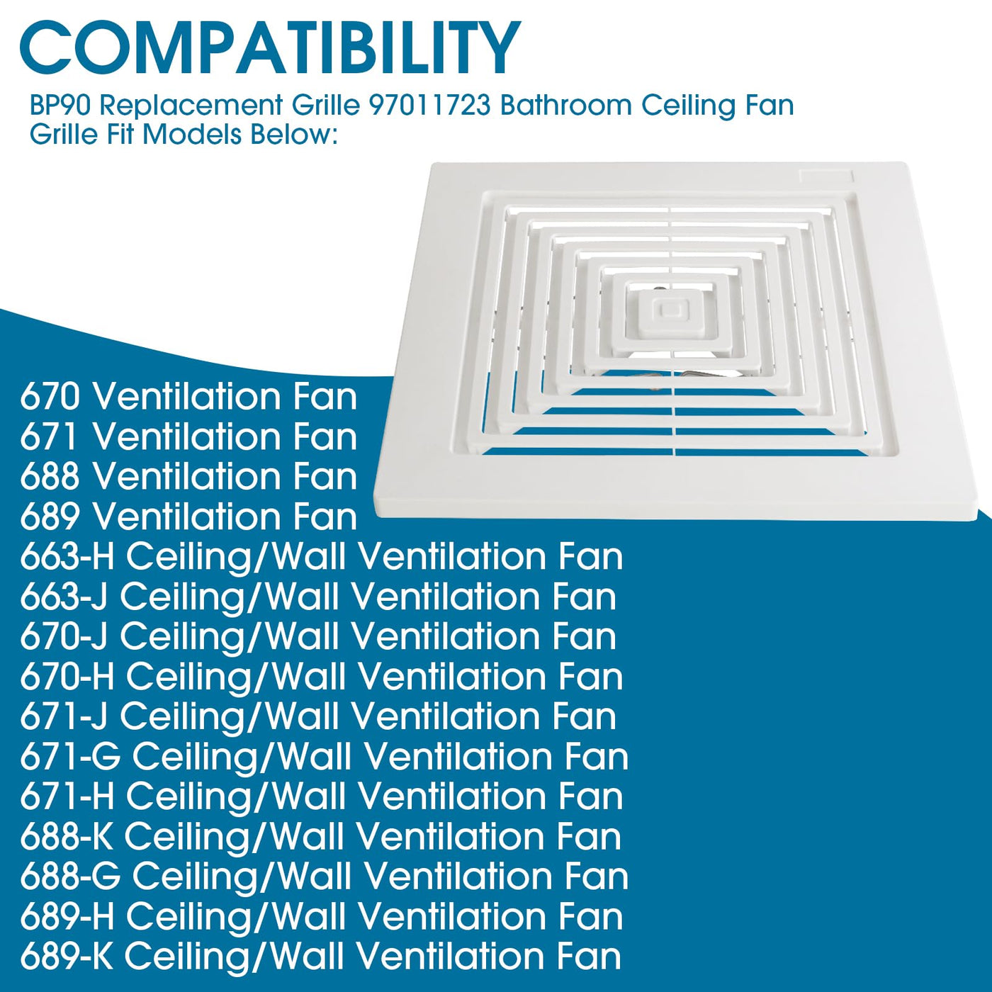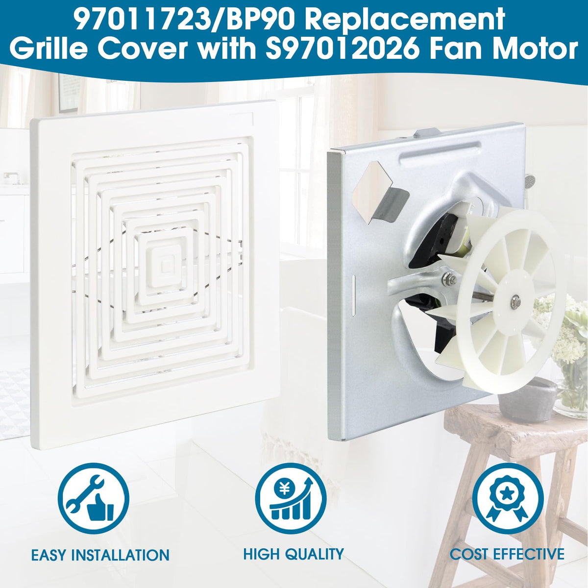 S97012026 Fan For Nutone 696N-R02 B Unit Fan With Replacement 97011723 Grille For Broan-Nutone Bp90 S97011723 Grille Cover: Bp90 Grille Spring Clips Spacing Are 7'' Replacement Grille Cover Size Is 9 X 9-1/2'' X 0.39'' 97011723 Replacement Grille For Broan-Nutone Part Numbers: S97011723, Bp46, Bp90 Compatible With Broan 663, 670, 671, 688, 689 Ventilation Fans With 7.5'' X 7.25'' Housings S97012026 Fan For Broan Nutone: Compatible With Nutone 696N-R02 B, 696N-R01 B,695-R02 B, 695-R01 B Compatible With Broan 688 688-K, 688-H, 688-J, 688-G,663-G, 663-H,663-J S97012026 Fan For Nutone 696N-R02 B Unit Replaces Motor#97008322 97012026 S97008322 Easy To Install: Just Remove The Ceiling Fan Cover, Some Screws For Fan Insert, Unplug The Unit And Replace With The New S97012026 Bathroom Fan Motor Assembly. Squeeze The Metal Spring Of The 97011723 Fan Grille Cover And Insert It Into The Bathroom Ceiling To Hold It In Place, No Drywall Or Ceiling Cutting Required! Must Have For Bathroom Vent Fan: Replace Old Yellowed Stained Bathroom Vent Cover Bp46 Bp90 For Broan Nutone Not Only Restore The Functionality Of Your Bathroom Ventilation System, But Also Extend The Life Of The Bath Fan. The S97011723 Bathroom Ceiling Fan Grille With Springs Fit Safely And Comfortably, Preventing The Fan From Rattling Or Working Erratically Brightening The Bathroom For A Clean And Bright Look While Ensuring Effective Air Circulation In Your Home. Warm Tips: Package Including S97012026 Fan Motor And 97011723 Grille Cover. Pls Check The Models To Ensure Compatibility With The Bp46 Bp90 Bathroom Ceiling Fan Grille And 696N-R02 B Unit For Nutone S97012026 Fan.