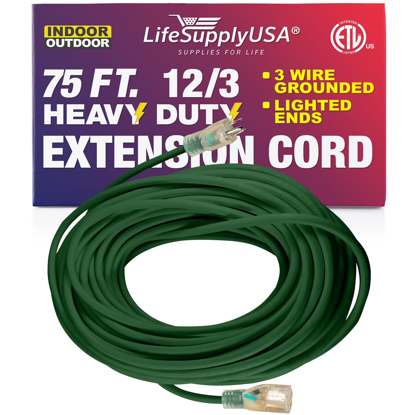 75 Ft Power Extension Cord Outdoor & Indoor Heavy Duty 12 Gauge/3 Prong Sjtw (Green) Lighted End Extra Durability 15 Amp 125 Vol