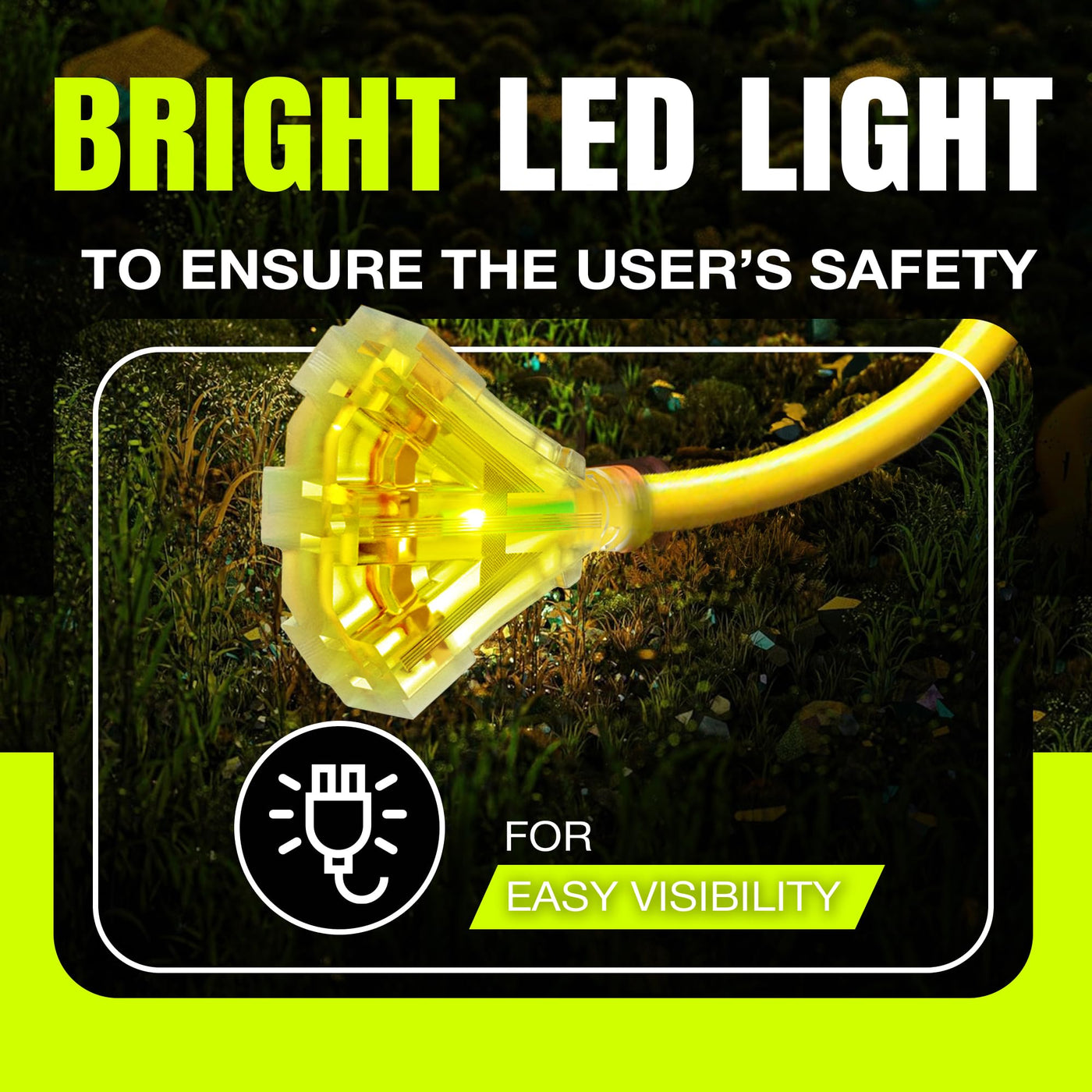 Q: How does the lighted end of the extension cord enhance safety?A: The lighted end indicates when power is flowing through the cord, improving visibility and safety in dimly lit areas, which minimizes tripping hazards.
