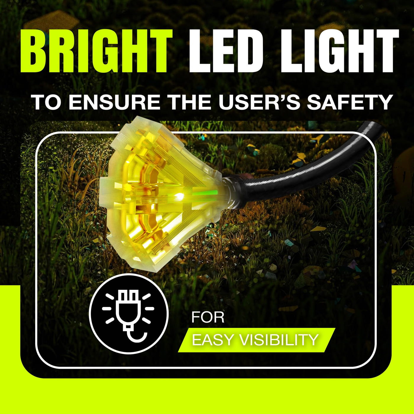 Q: How does the lighted end feature enhance safety when using the cord?A: The lighted end of the extension cord indicates when power is on, providing a visual cue that enhances safety and helps prevent accidental disconnections in busy or dimly lit areas.
