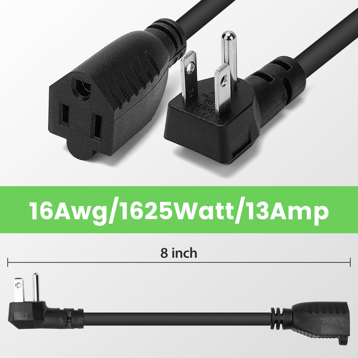 8 Inch Short Power Extension Cord 2 Pack,90-Degree Low Profile Flat Plug 3-Prong Male To Female Heavy Duty Grounded Power Extension Cable Outlet Saver Socket Adapter, Etl Listed, 16Awg, Sjtw 13A 1625W