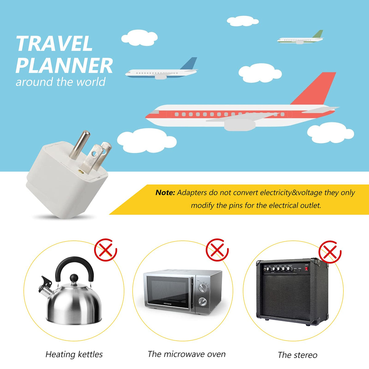 Q: Is this adapter suitable for travel to all countries?A: Yes, this adapter allows European, Swiss, AU, UK, and China appliances to be used in countries such as the United States, Canada, Japan, and many more. However, it is important to note that this adapter does not convert voltage.
