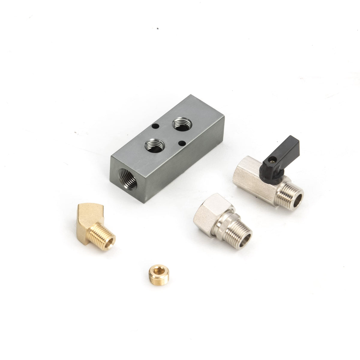Q: What is included in the Air Compressor Outlet Kits?A: The kit includes 3/8" NPT Brass Valves, a 1/4" NPT Plug, 3/8" NPT x 1/4" NPT Blocks, and a 1/4" NPT 45" Elbow Adapter, providing everything you need for a complete installation.
