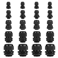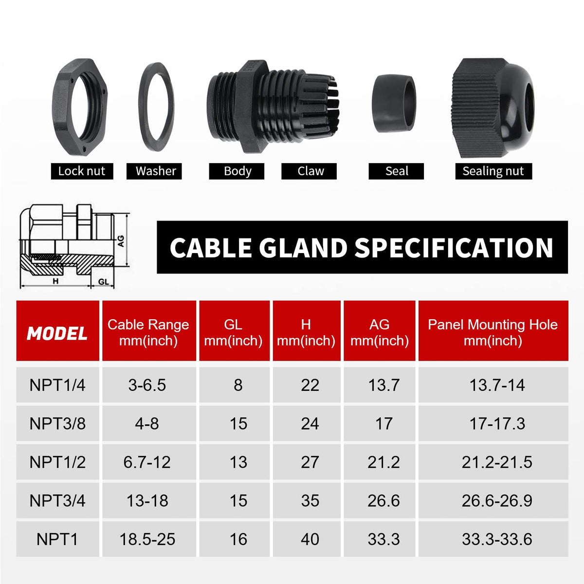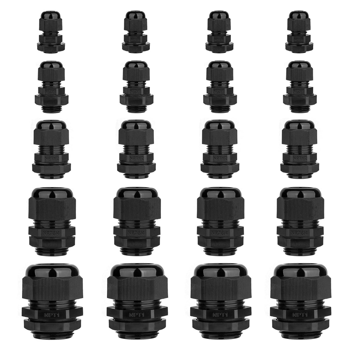 Q: What sizes are included in the AMPELE Cable Gland 20 Pack?A: The AMPELE Cable Gland 20 Pack includes five different sizes: NPT 1/4, NPT 3/8, NPT 1/2, NPT 3/4, and NPT 1, totaling 20 pieces to accommodate various cable connections.