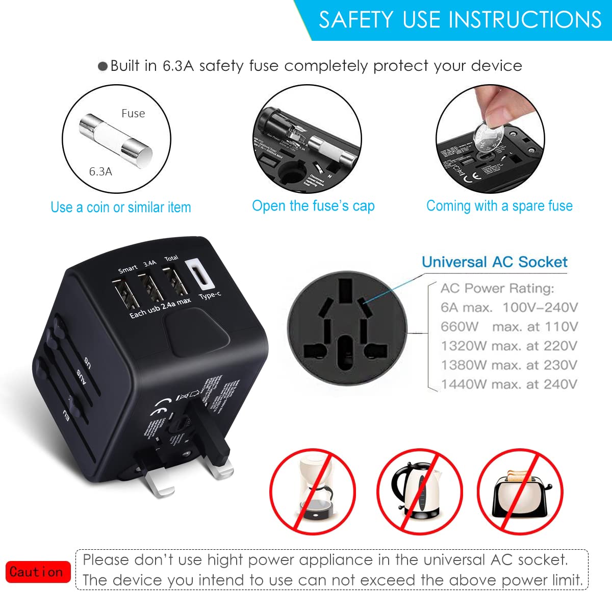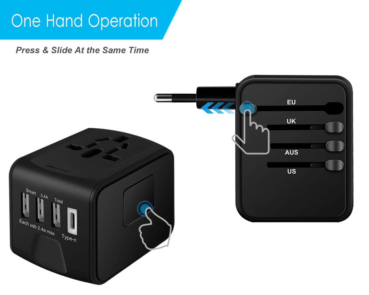 This Universal Travel Adapter Is Recommended By Many As A Must-Have For Worldwide Traveling , Solve All Your Troubles In Charging When You Are In A Foreign Land Type Eu Germany, France, Italy, Spain, Sweden, Greece, Most Europe, India, Turkey, Etc Type Uk Uk, Ireland, Malaysia, Singapore, Hong Kong, Iraq, Qatar, The United Arab Emirates, Etc Type Aus Australia, China, Fiji, New Zealand, Argentina, Uruguay, Etc Type Us Usa, Canada, Mexico, Japan, Brazil, Cuba, Panama, Peru, Philippines, Thailand, Venezuela, Etc Features: Instead Of Carrying So Many Confusing Chargers When Traveling In Other Countries, You Actually Only Need This Small All In One Travel Adapter Support 5 Devices Charging At The Same Time Without Any Mess At All, Optimized To Deliver Fast, Safe And Efficient Charging Easy To Use, Just Press The Biggest Button And Push The Prongs Accordingly To Get The Plug You Need Specifications: Power Range: Ac 100V-240V, Max 63A Output (630W Max At 100V, 1500W Max At 240V) 1 X Type C Usb Output: 5V 3A Max 3 X Standard Usb Each Output 5V 24A Max Built-In Safety Shutters & Fuse System Led Power Indicator Package List: - 1 X Travel Adapter