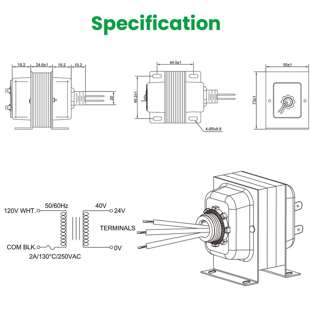?Specification?Input: 120 V 50/60Hz; Output: 24 V 40Va, This 24 Volt Transformer Is Offers Reliable Performance And Safe To Use&Nbsp;?Universal Compatibility? This 24V Transformer Fits For Nest, Ecobee, Honeywell And Sensi Smart Thermostats; Also Compatible With Ring Video Doorbell, Ring Video Doorbell 2, Ring Video Doorbell Pro, Nest Skybell Doorbell, And Other Devices That Require Constant 24 Volt Power For Operation&Nbsp;?Power Multiple Thermostats/Doorbells?Replace And Upgrade Underpowered Transformers With This 24V Ac Transformer, While Providing Ample Power To Single Or Multiple Thermostats And Doorbells(Perfect Replacement For An Old Transformer And Will Work With Any Wired Door Chime)&Nbsp;?Easy To Install?The Doorbell Transformer Is Easy To Replace And Install With Screws, Unscrews Or Threaded Clips To The Electrical Box, In A Safe Place&Nbsp;?Customer Service?If Our 24V 40Va Doorbell Transformer Fail To Meet Your Expectations, Please Get In Touch With Us And We'Ll Try To Resolve The Issue. If Unresolved, You'Ll Get A Refund Or Replacement.