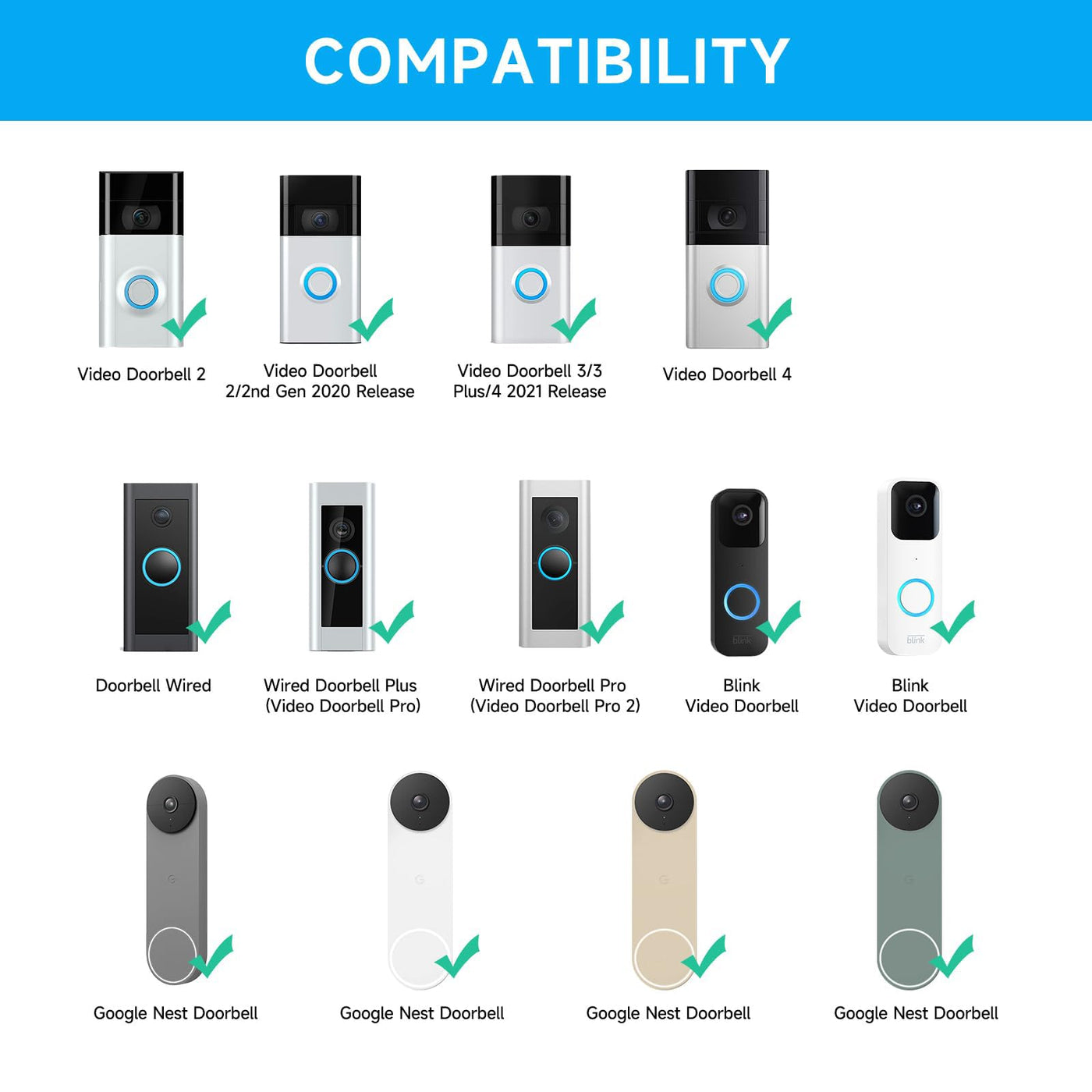Q: Is the Ayotu Waterproof Adjustable Angle Mount compatible with all doorbells?A: The Ayotu Waterproof Adjustable Angle Mount is specifically designed for Blink Video Doorbell, Google Nest Doorbell (Wired), and various models of Video Doorbell Wired, including Pro versions. It is not compatible with Elite, Eufy, or Wyze doorbells.