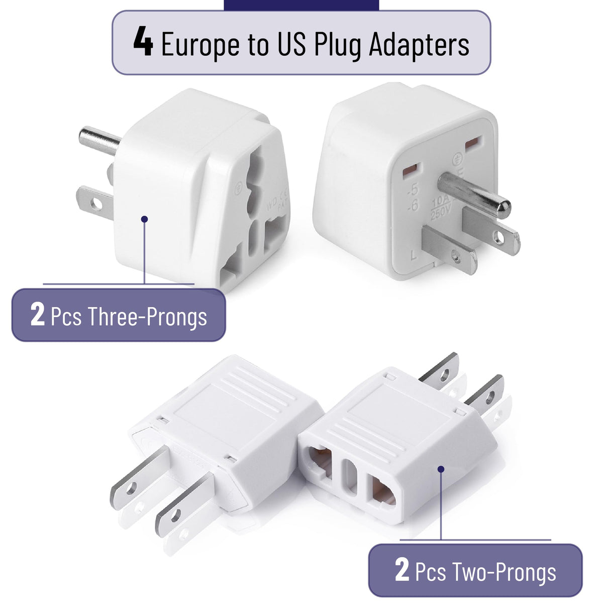 Q: How many adapters are included in the Bates plug adapter set?A: The Bates plug adapter set includes a total of 4 adapters: 2 Europe to US plug adapters and 2 European plug adapters, ensuring you have the necessary options for your international travel needs.