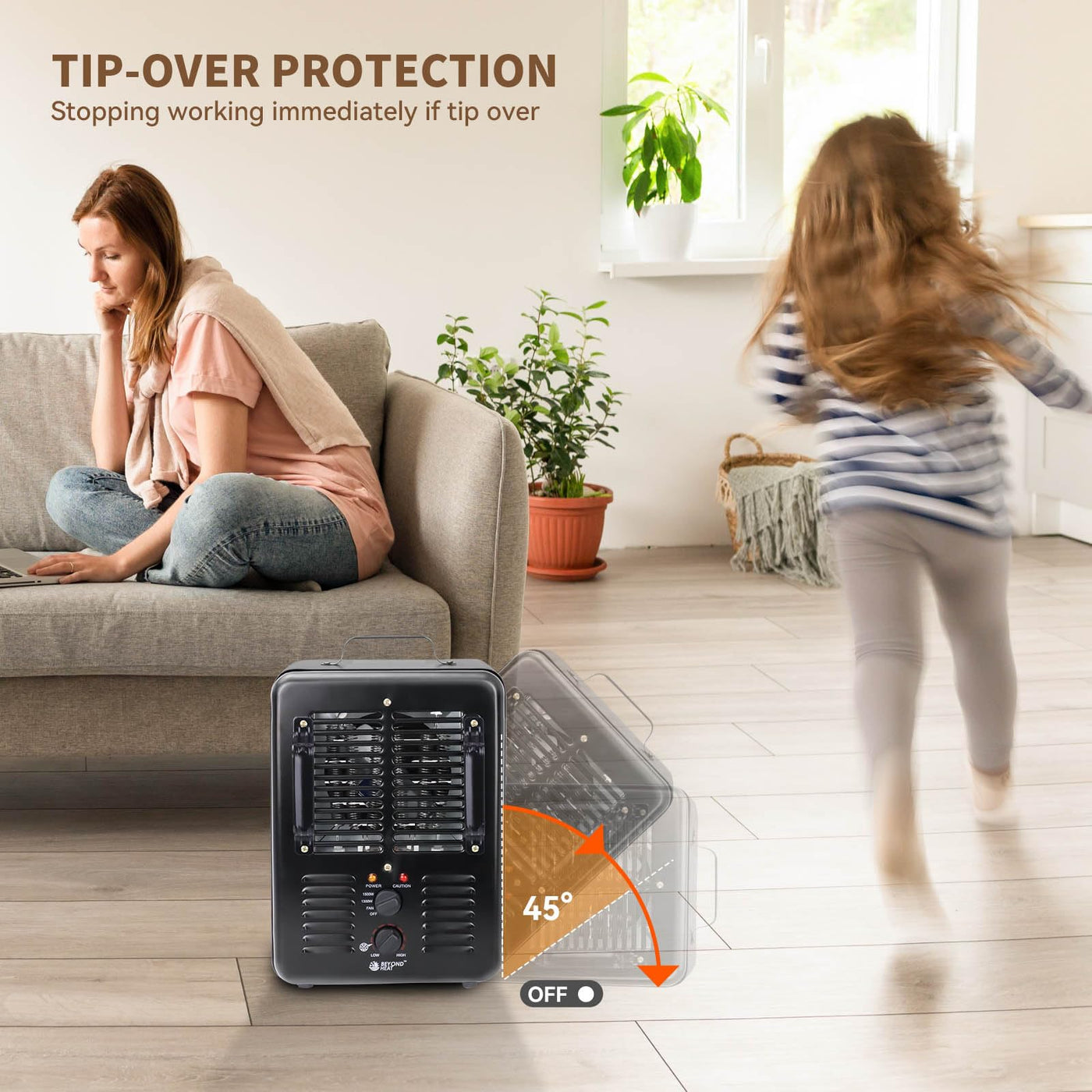 Q: Is the BEYOND HEAT Milkhouse Space Heater safe to use?A: Yes, the BEYOND HEAT Milkhouse Space Heater is designed with safety in mind. It features a tip-over switch that automatically shuts off the heater if it falls over, and an automatic overheat protection device that turns the heater off if it gets too hot.