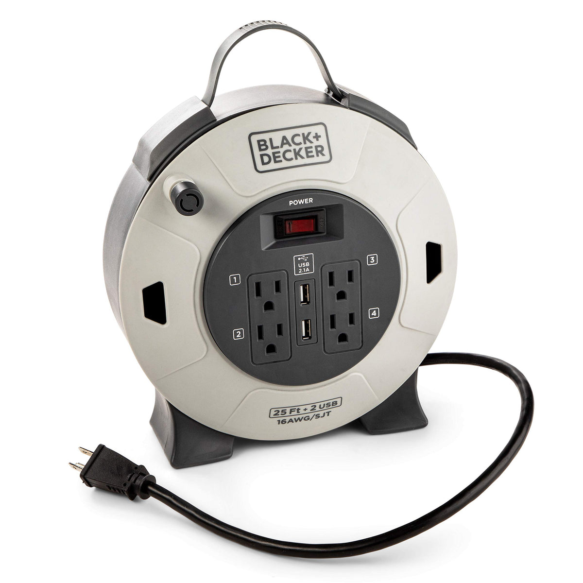 Easily Supply Power Anywhere In Your Home With This Extension Cord Reel With 4 Outlets And 2 Usb Ports (2.1A) From Black + Decker! This Convenient Retractable Electric Cord Reel Features A 25-Foot 16 Awg Cable That Makes It Ideal For Small, Indoor Spaces, And It Will Provide Heavy-Duty Power To Small Appliances And Electrical Tools. Our Power Cord Retractor Includes A Built-In Circuit Breaker That Will Automatically Go Off When The Rated Current Or Voltage Is Exceeded To Protect Your Devices From Damage. This Retractable Power Extension Cord Includes 4 Grounded Outlets, 2 Usb Ports (2.1A) Ideal For Smart Devices, And A Convenient On/Off Power Switch. It Offers A Slim Design With A Comfortable, Ergonomic Handle That Makes It Easy To Carry Wherever You Need It, And Store It Away When Not In Use! Plus, Our Extension Cord Reel With Outlets Has An Easy-To-Use Rewind Handle On The Back So That Your Cords Will Stay Neat And Organized, And You Never Have To Worry About Them Getting Tangled. At Black + Decker, We Have Made It Our Mission To Provide High-Quality Household Products And Retractable Electric Cord Reels That Suit The Needs Of Our Customers. We Have Earned A Reputation For Quality, Ingenuity, And Value That You Can Depend On. Our Etl-Certified Retractable Garage Power Cord Is The Perfect Solution To Provide Power Anywhere You Need It - From Small Indoor Spaces To Apartments, Offices, And More. Always Have The Power You Need Anywhere In Your Home With The Black + Decker Extension Cord With Multi-Outlets And Usb Ports! Product Details: (1) Cord Reel Length: 25 Feet Cable: 16Awg - Sjt Usb: 2.1A Rated: 10A/125V/1250W Etl Certified 3-Year Warranty
