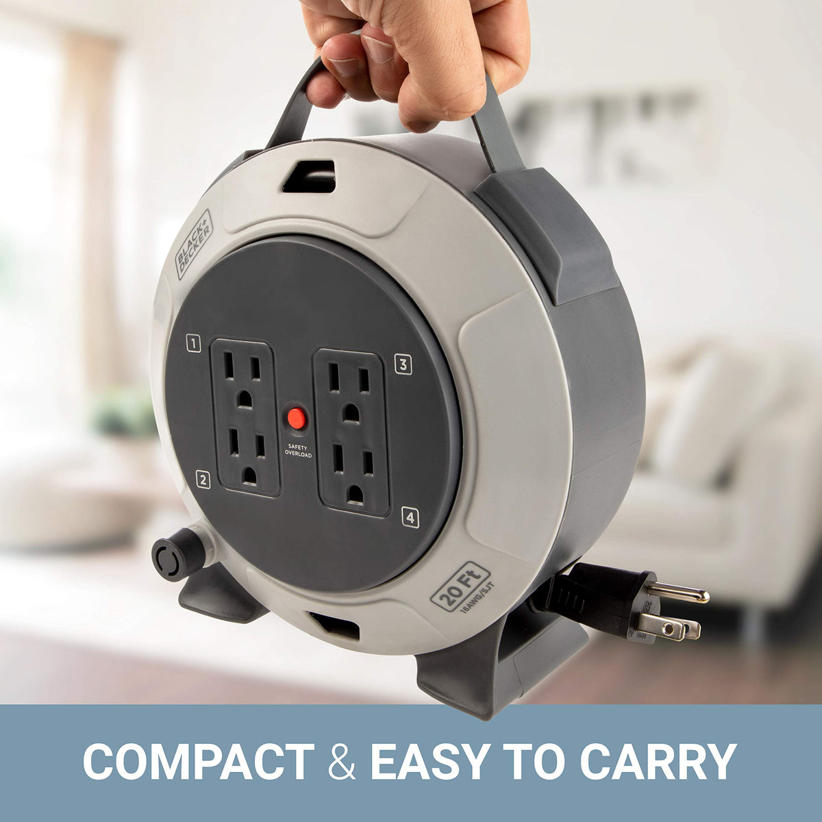 Black+Decker Retractable Extension Cord Reel 20 Ft. With 4 Outlets, Multi Plug Extension, Thermal Breaker Reset Button & Heavy D