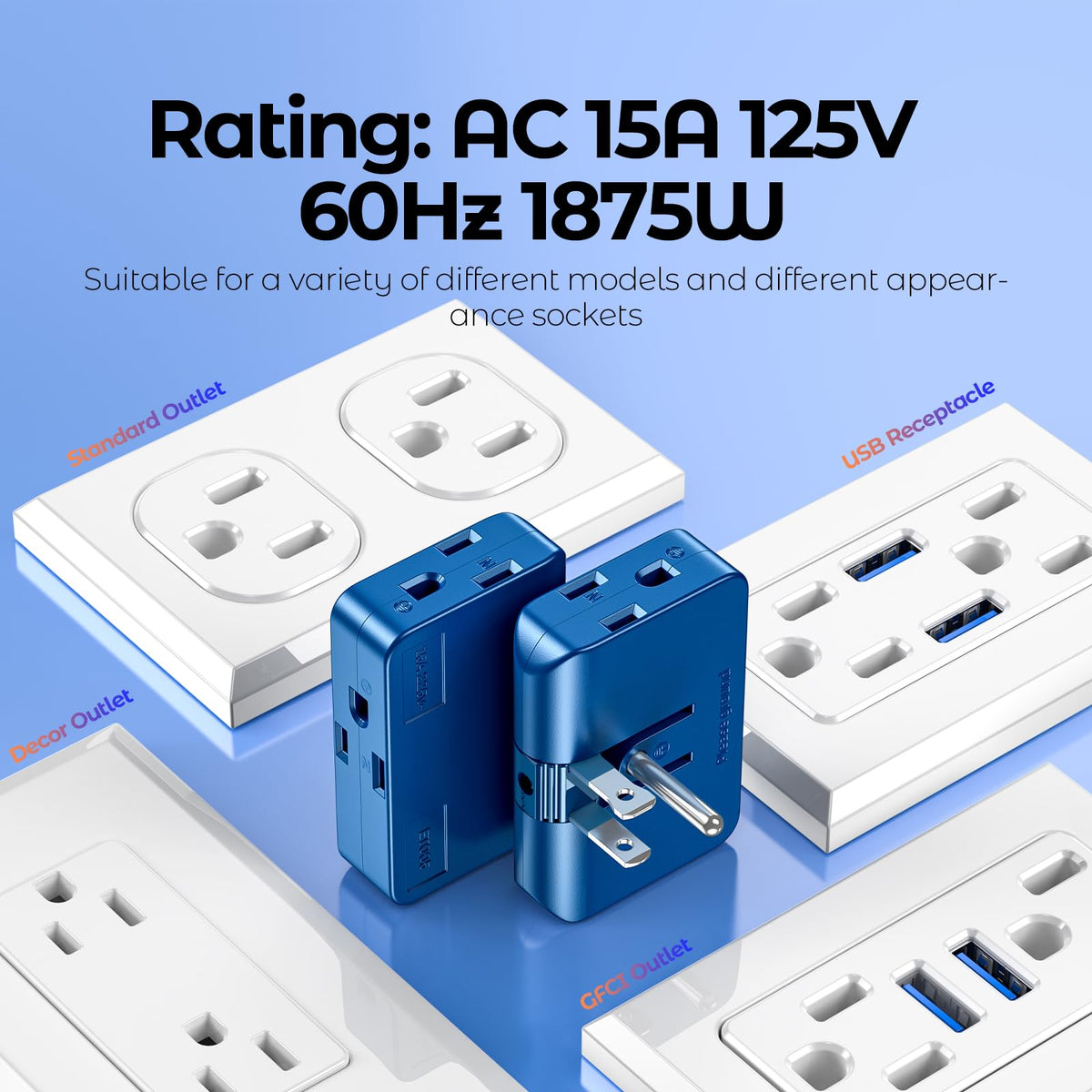 Blue Outlet Splitter With 3 Prong Plug Extender 3 Plug Wall Adapter, Converts 2 To 3 & 3 To 2 Prong, Ideal For Multiple Outlet