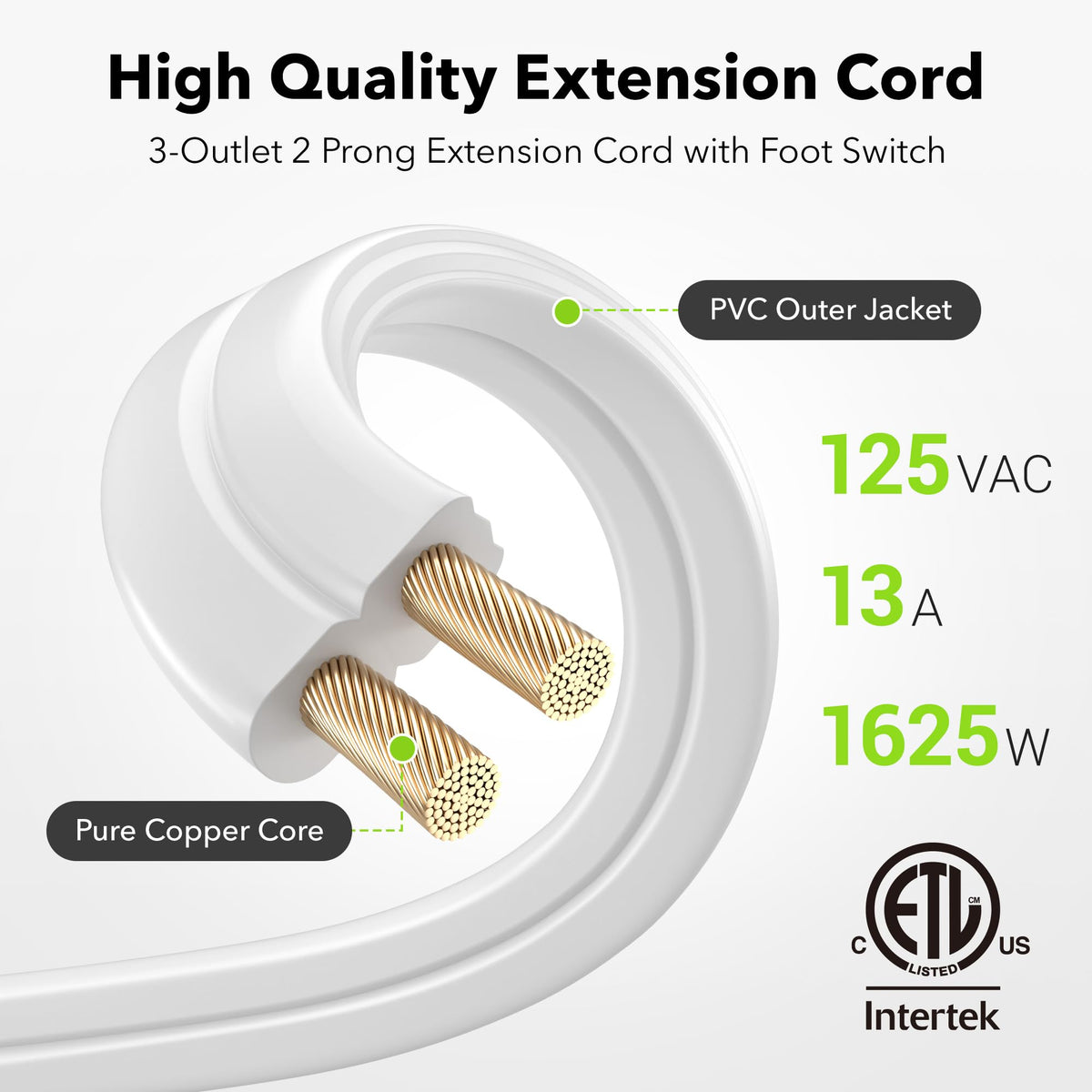 Q: What devices can I connect to the BN-LINK 12ft Extension Cord with Footswitch?A: The BN-LINK 12ft Extension Cord with Footswitch is perfect for connecting a variety of devices such as lamps, phone chargers, small appliances, and holiday decorations like Christmas lights. With three grounded two-prong outlets, you can power multiple items simultaneously.