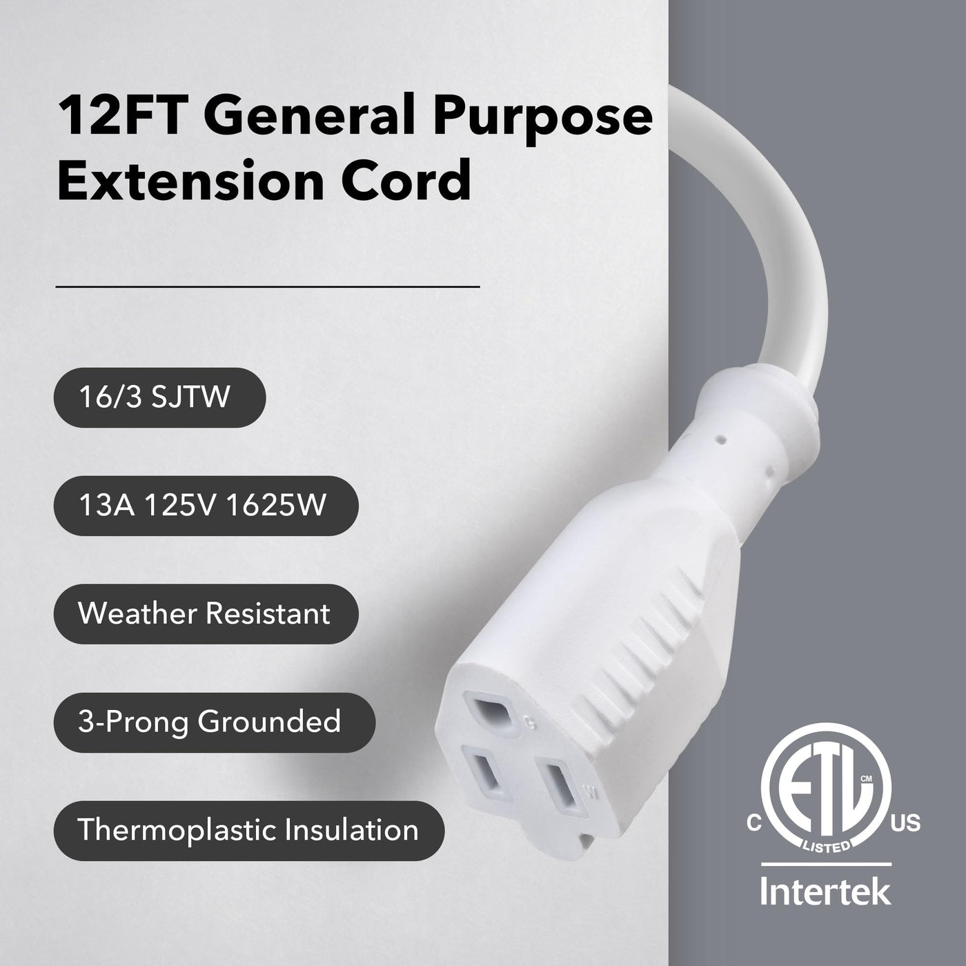 Bn Link 12Ft Outdoor Extension Cord, 3 Prong, 16 Gauge General Purpose Power Cord, Grounded Plug, White, For Landscaping & Holid