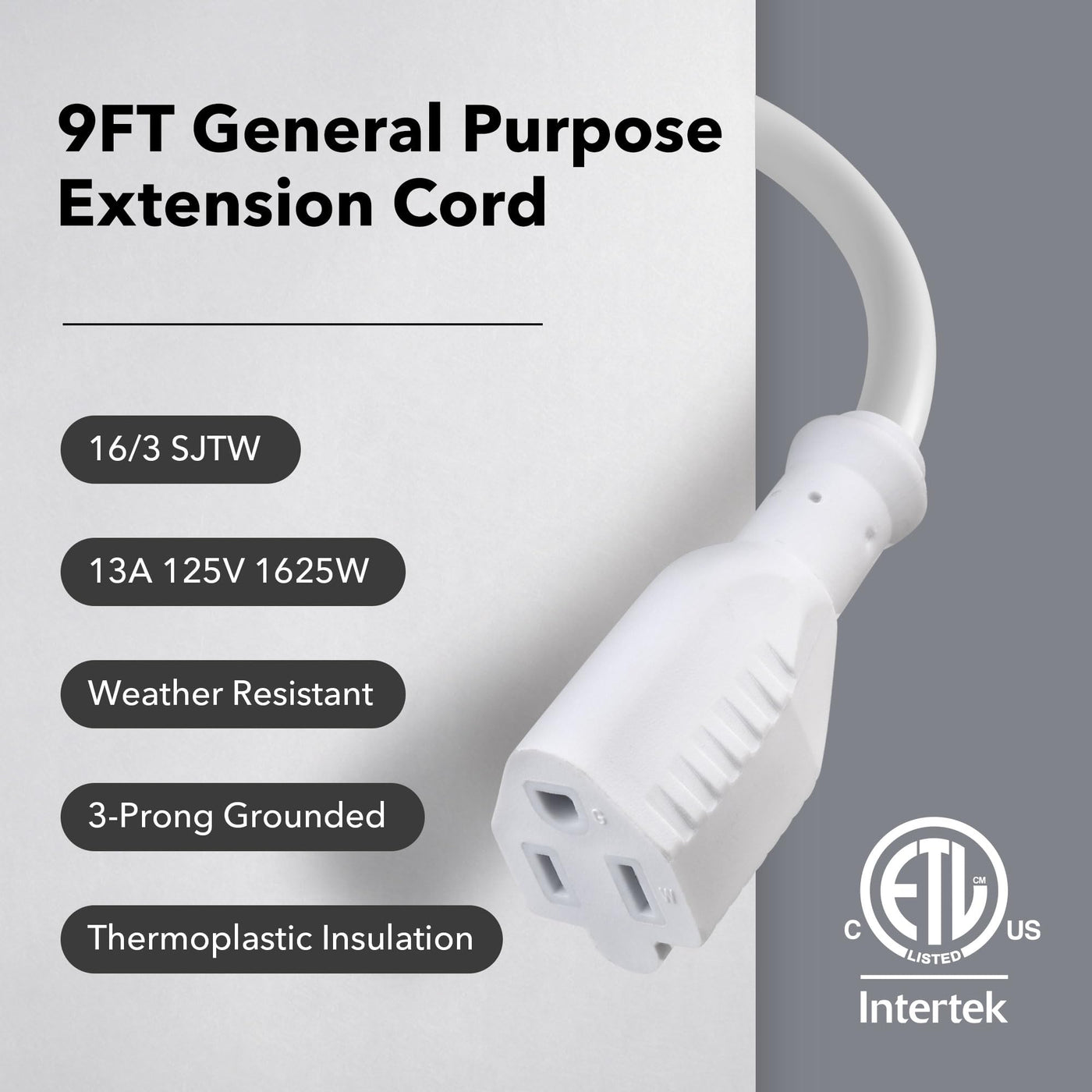 Bn Link 9Ft Outdoor Extension Cord, 3 Prong, 16 Gauge General Purpose Power Cord, Grounded Plug, White, For Landscaping & Holida