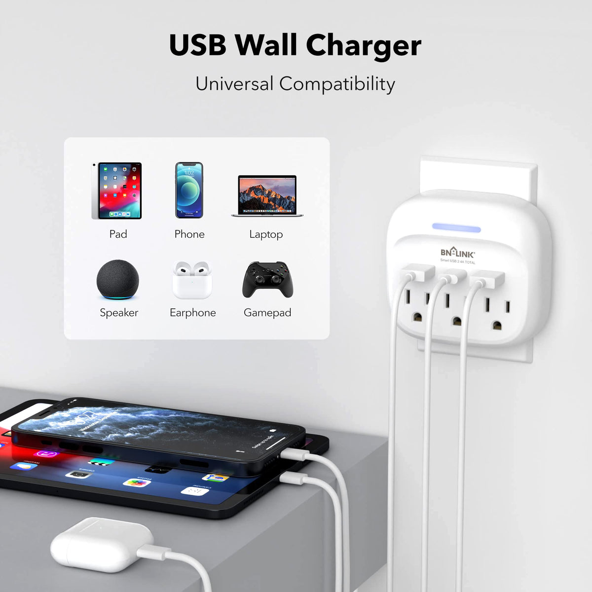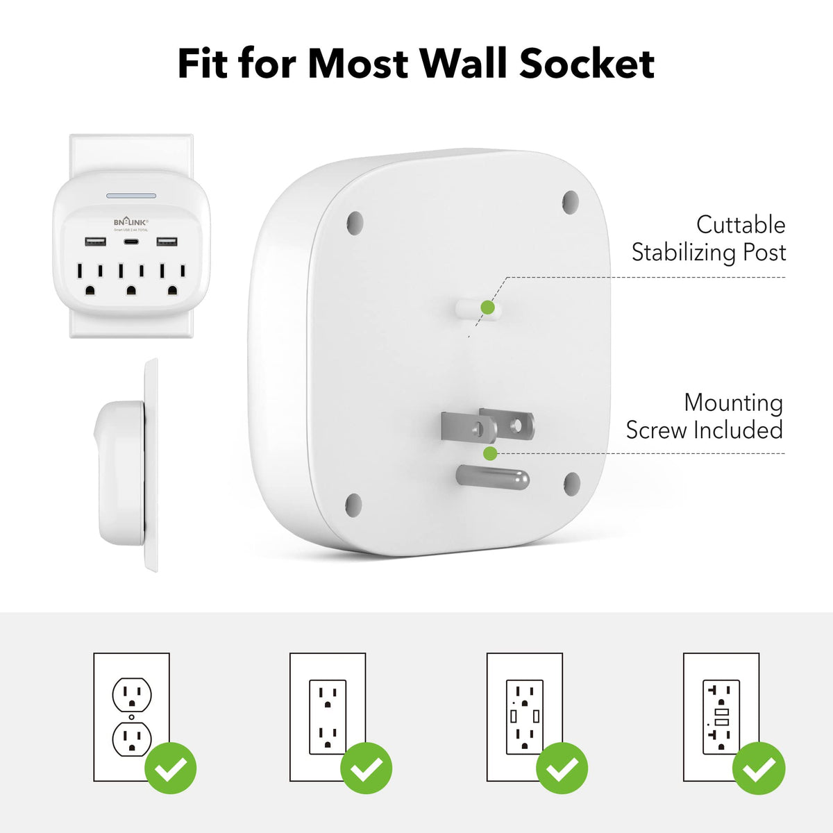 Bn-Link Multi Plug Outlet With Usb Ports, 3-0Utlet Wall Mount Outlet Extender With 3 Usb Charging Ports(1 Type-C) 2.4 A Total, Wall Outlet Extender For Home/Office/Travel/School Rated Power: 1875W-15A Max. 125V 60Hz; Combined Usb Output Rating: 5V 2.4A; Individual Usb Output Rating: 5V 2.4A