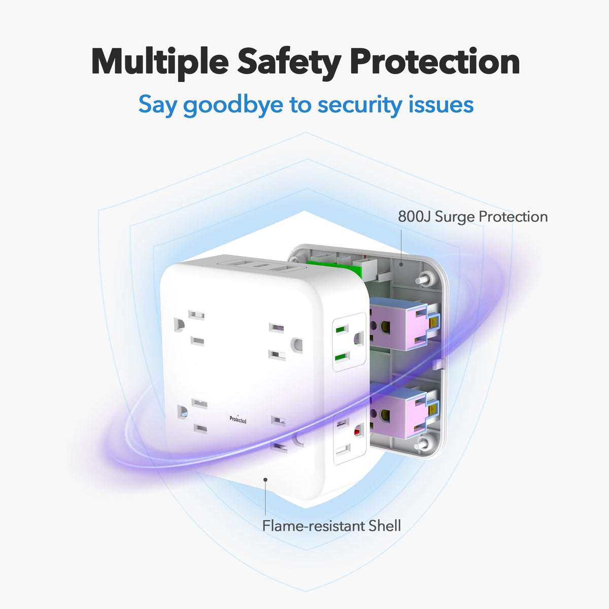 Q: What kind of surge protection does this outlet extender provide?A: This outlet extender comes with built-in 800 Joules surge protection, ensuring your devices are safe from power surges. The 'Protected' LED indicator light also signals that the surge protection is functioning.