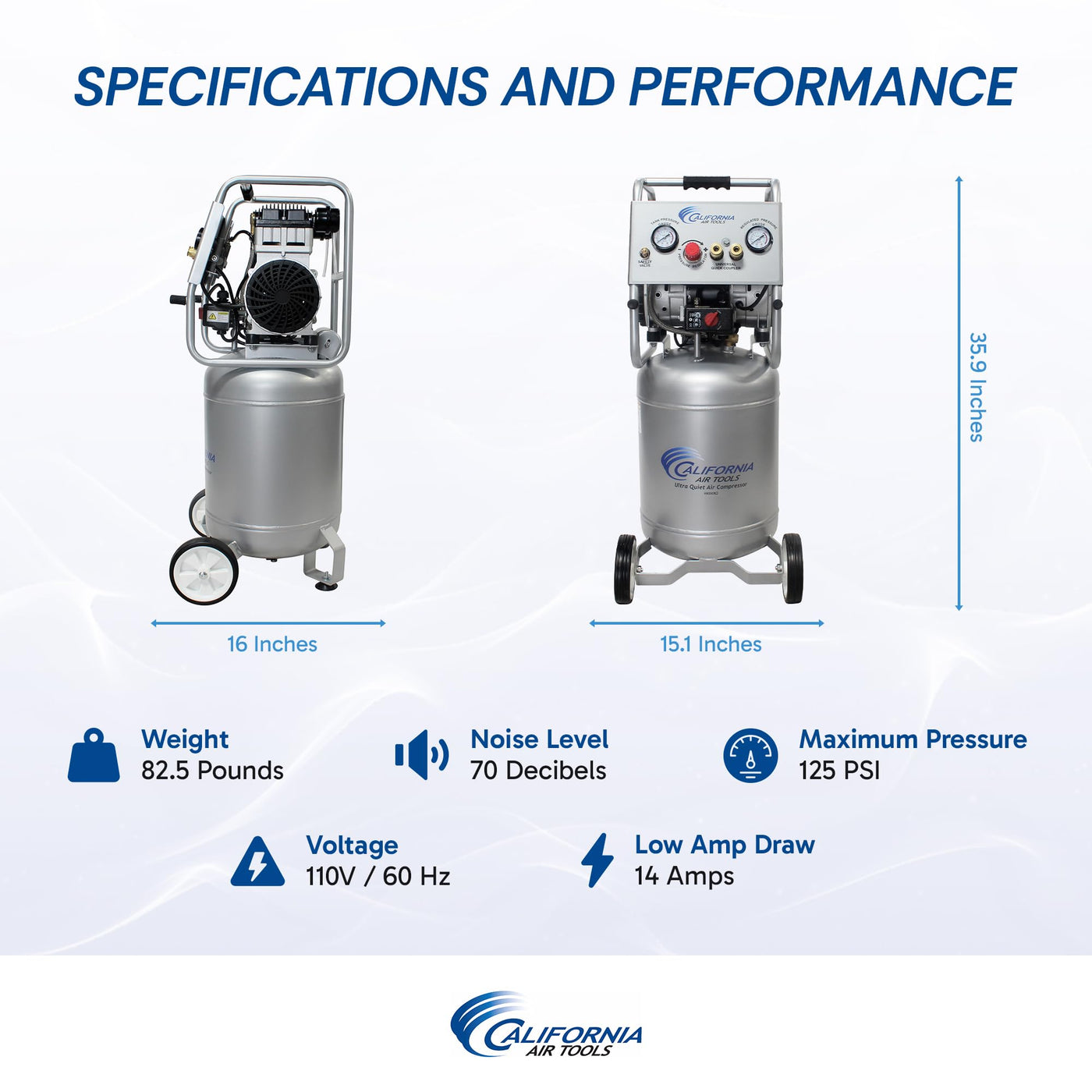 Q: Is the 10-gallon tank sufficient for my needs?A: Yes, the 10-gallon steel tank of the California Air Tools 10020CAD is ideal for job sites, garages, and workshops. It offers ample air capacity with a maximum pressure of 125 PSI, making it suitable for a variety of applications, from powering tools to inflating tires.