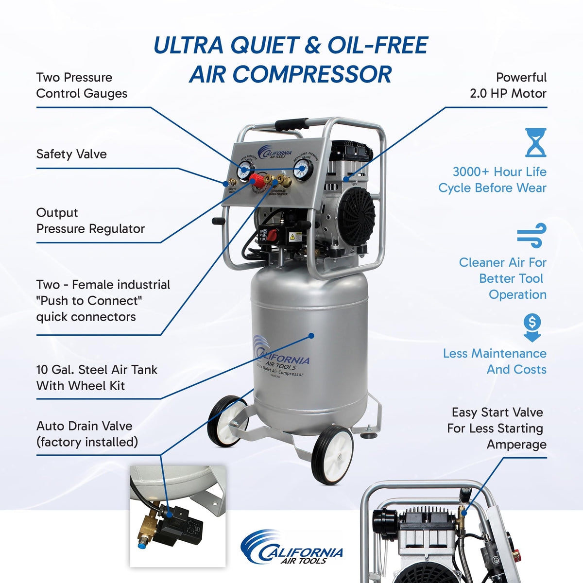 California Air Tools 10020Cad 2.0 Hp Ultra Quiet And Oil Free Air Compressor, 10 Gallon Steel Tank With Wheels, 70 Dba Noise Lev
