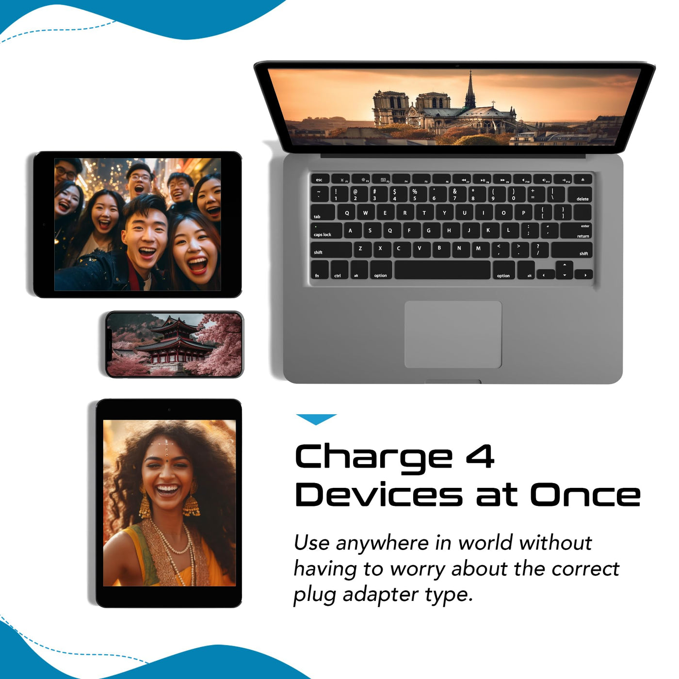 Q: What devices can I charge with the Ceptics International Power Plug Adapter?A: The Ceptics International Power Plug Adapter allows you to charge up to four devices simultaneously. It features two USA outlets and one USB port along with one USB-C port, making it ideal for charging cell phones, tablets, laptops, cameras, and other electronics.
