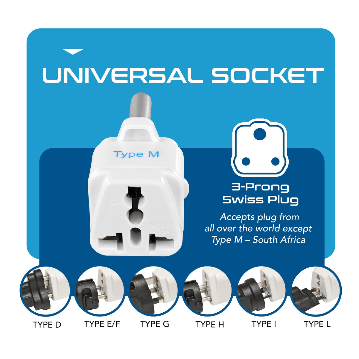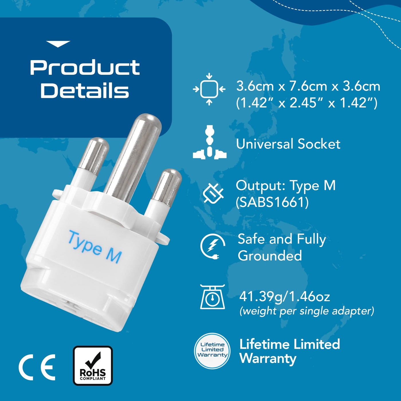 Small Travel Size - 3 Pack | Standard: Type M Plug, South Africa Cee 7/16. Grounded 3-Prong Plug. | Accepts Plugs From All Countries Including Usa. | New Conductivity Design - Internal Metal Interfaces Provides Better Conductivity | Grounded 3 Round Prong Plug. Max Capacity Up To 3000 Watt (Max 250 Volt, 13 A) | Lifetime Limited Warranty Included