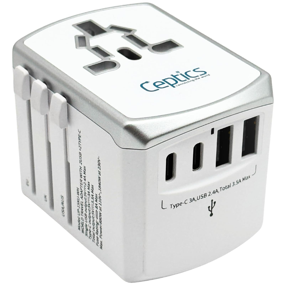 [Universal Outlets] Ceptics Compact And Lightweight Universal Power Adapter Is Travel-Friendly, Fitting Easily Into Your Luggage. Its All-In-One Design Eliminates The Need For Multiple Chargers, Making It The Ultimate Travel Adapter For Staying Powered On The Go. | [Travel Power Adapter] Equipped With A Universal Outlet, This Universal Plug Adapter Supports A Wide Variety Of Plug Types, Making It Ideal For Charging Laptops, Cameras, And Other Electronics, No Matter Where You Are. | [Global Compatibility - Type A, C, G, I Outputs] It Features Type A, C, G, And I Outputs, Making It Suitable For Use In Over 150 Countries, Including The Us, Uk, Eu, And Au, The Ceptics Universal Travel Plug Adapter Ensuring Hassle-Free Charging With This Global Travel Adapter. | [World Travel Adapter With Usb Ports] Perfect For Modern Travelers, This World Travel Adapter Includes 2 Usb-A And 2 Usb-C Ports 17.5 W Max Power Allowing You To Charge Up To 5 Devices Simultaneously. It? The Ideal International Adapter For Smartphones, Tablets, Laptops, And More For 110V-240V Devices | [2-Year Manufacturer Support] Travel Plug Adapter Worldwide Comes With 2 Years Manufacturing Support Providing Peace Of Mind With Its Durable Construction And Reliable Products. Ceptics Guarantees Durability And Reliability With This International Adapter. Note: This Adapter Does Not Convert Voltage, Ensure Your Devices Support 100-240V Voltage.