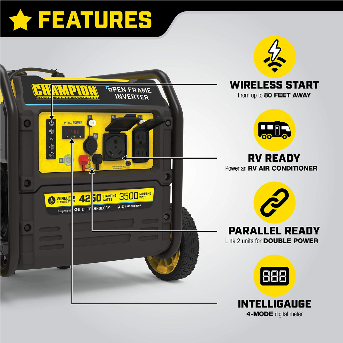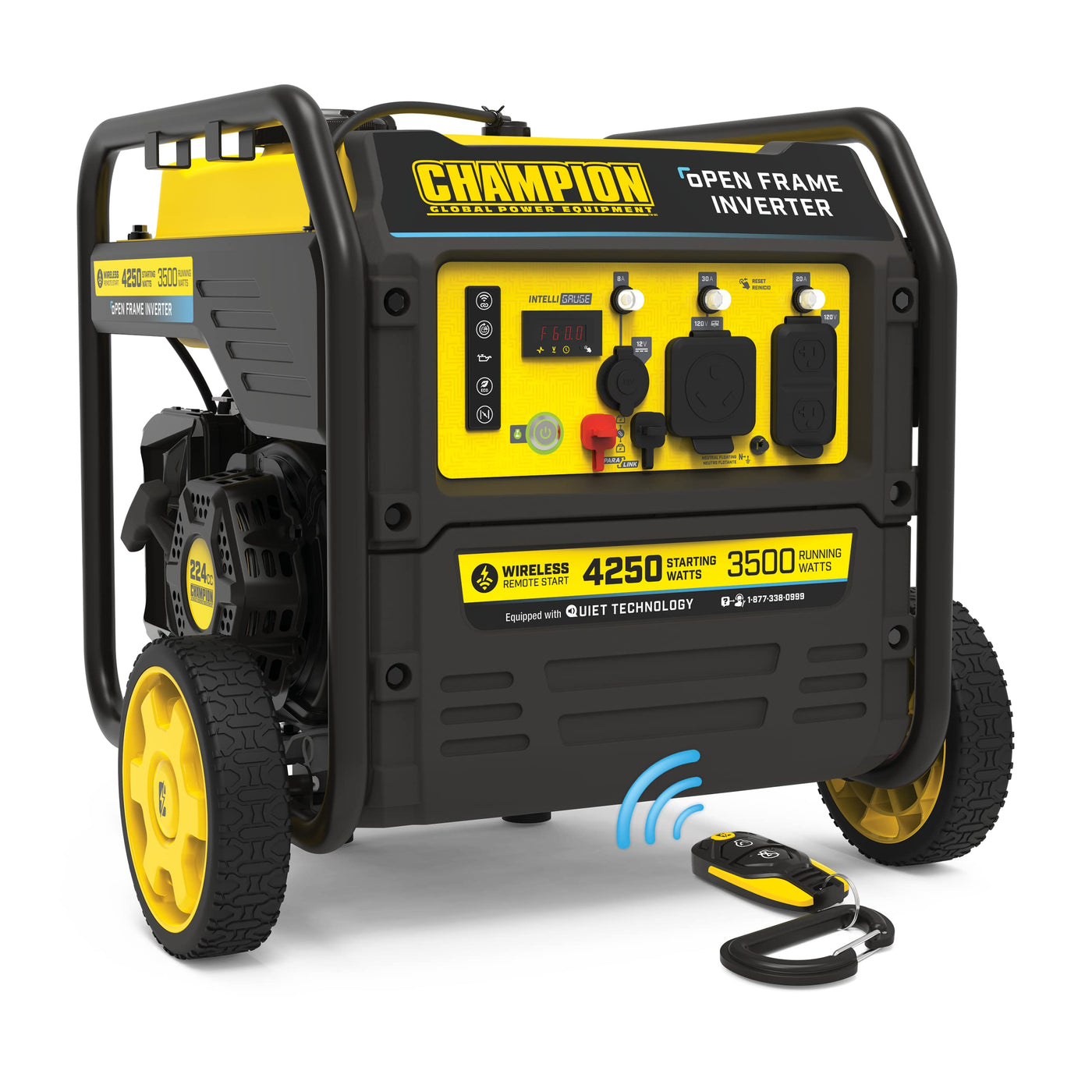 The Champion Power Equipment 4250-Watt Open Frame Inverter Generator Is One Of The Most Innovative Products On The Market Our Advanced Technology And Innovative Design Will Improve The Way You Power Your Life Championas Got Convenience Covered Starting And Stopping Your Generator From Up To 80 Feet Away With The Wireless Remote Key Fob Is A Snap First, We Cut The Noise Level In Half By Integrating Quiet Technology Digital Components Used In More Advanced Inverters Then, We Created An Efficient Mechanical Design To Decrease The Overall Footprint And Weight By 20 Percent A Quiet, Lightweight Addition To Your Rv And A Cost-Effective Power Solution, This Open Frame Inverter Is Smaller, Quieter, Lighterabetter Championas Recoil Start Features Cold Start Technology, Plus The Reliable 224Cc Champion Engine Produces 4250 Starting Watts And 3500 Running Watts, And Runs For 22 Hours At 25% Load When The 4-Gallon Fuel Tank Is Full With A 06-Quart Oil Capacity (Included 10W-30) And A Low Oil Shut-Off Sensor, This Inverter Operates At 64 Dba From 23 Feet, Which Is A Bit Louder Than Normal Speech Confidently Connect Your Sensitive Electronics Since This Inverter Produces Clean Power (Less Than 3% Thd) Our Quick Touch Panel Offers Fast Access To All Your Controls The Intelligauge Monitors Voltage, Frequency And Operating Hours With Ease, While Economy Mode Monitors Power Consumption In Real Time To Reduce Engine Wear And Tear As The Electrical Load Is Reduced, The Inverter Reduces Engine Speed, Providing Quieter Operation, Extended Engine Life And Higher Fuel Economy The Covered Outlets In This Rv Ready Inverter Include A 120V 30A Rv (Tt-30R), Two 120V 20A Household Outlets (5-20R) Plus A 12V Automotive-Style Outlet, And A Handy Dual Port Usb Adapter The Optional Parallel Kit (Sold Separately), With Included Standard 50-Amp Rv Outlet, Provides A Clip-On Connection Which Allows You To Increase Output By Connecting Up To Two 2800-Watt Or Higher Inverters Or Digital Hybrids Buy This Fully Assembled Carb Compliant Generator With Confidence - Champion Support And Our Nationwide Network Of Service Centers Will Back Up Your Purchase With A 3-Year Limited Warranty And Free Lifetime Technical Support