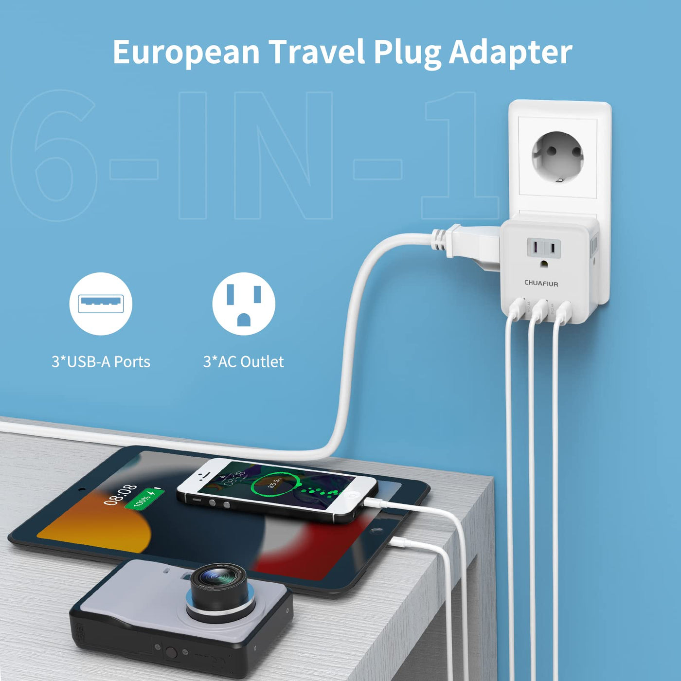 Chuafiur European Travel Plug Adapter, International Power Plug Adapter With 3 Usb Ports And 3 Ac Outlets, Power Converter Us To