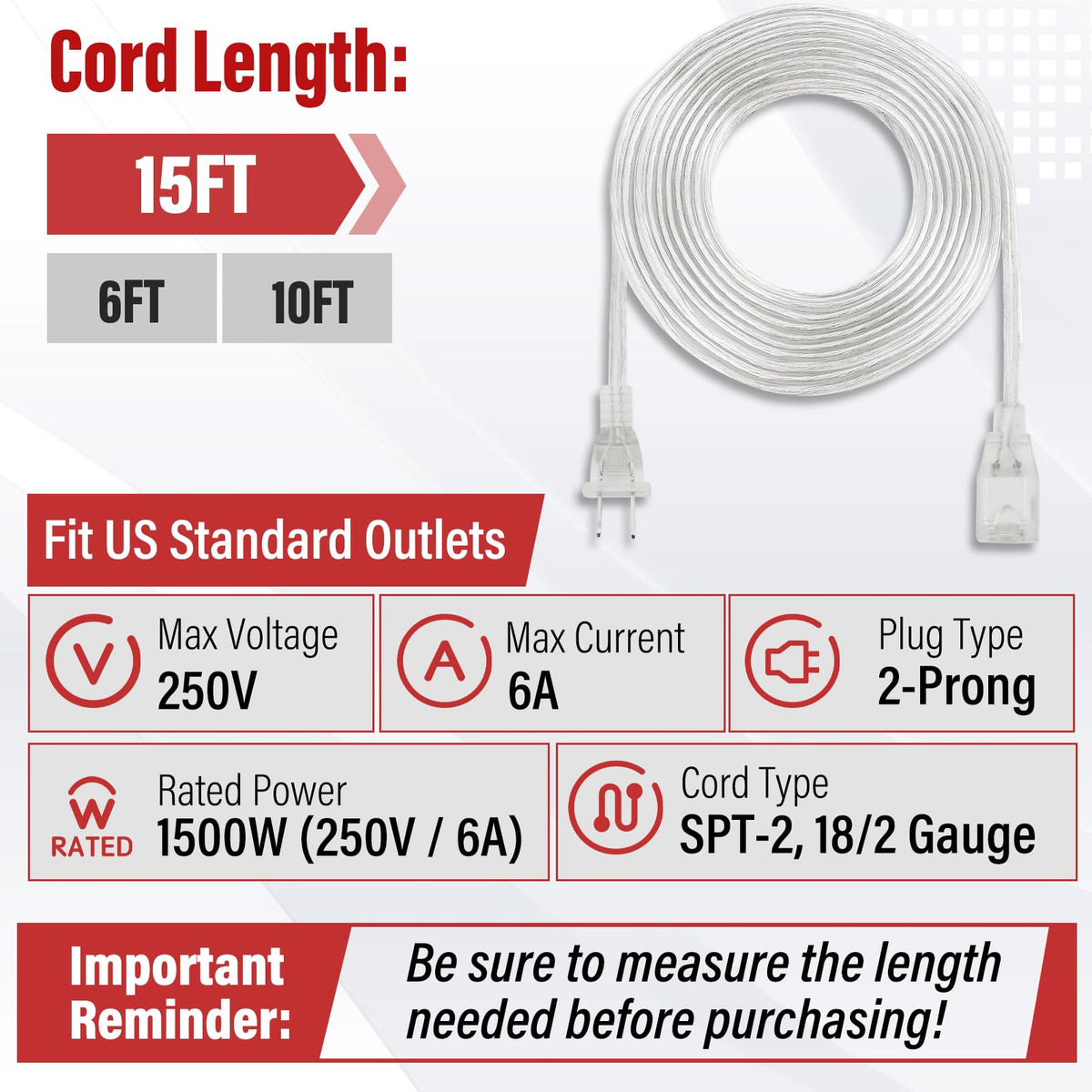 Q: How can I ensure I choose the right length for my needs?A: The clear extension cord is available in three lengths: 6ft, 10ft, and 15ft. We recommend measuring the distance from your outlet to your decorations to select the appropriate length and avoid messy tangles.