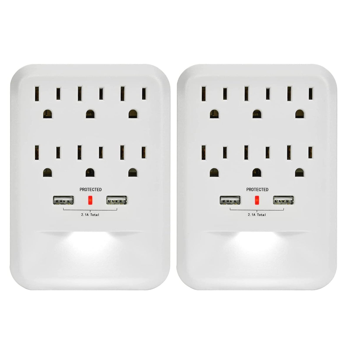 Clear Power 2Pack: 6 Outlet 600 Joule Surge Protector Wall Tap W/2 Port Usb A Charger & Nightlight, Cp30005X2