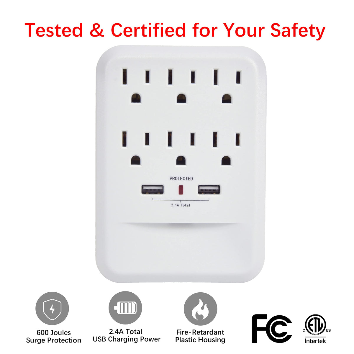 Clear Power'S 6-Outlet 600 Joule Surge Protector Wall-Tap Is Packed With Features Including A 3-Position Night Light That Can Be Turned On/Off By A Switch Or Controlled By A Dusk-To-Dawn Photosensor. It Also Has Two Usb-A Charging Ports With A Total Charging Load Of 2.1Amps/5Volts - Ideal For Cell Phones, Tablets, Bluetooth Devices And Other Small Electronics