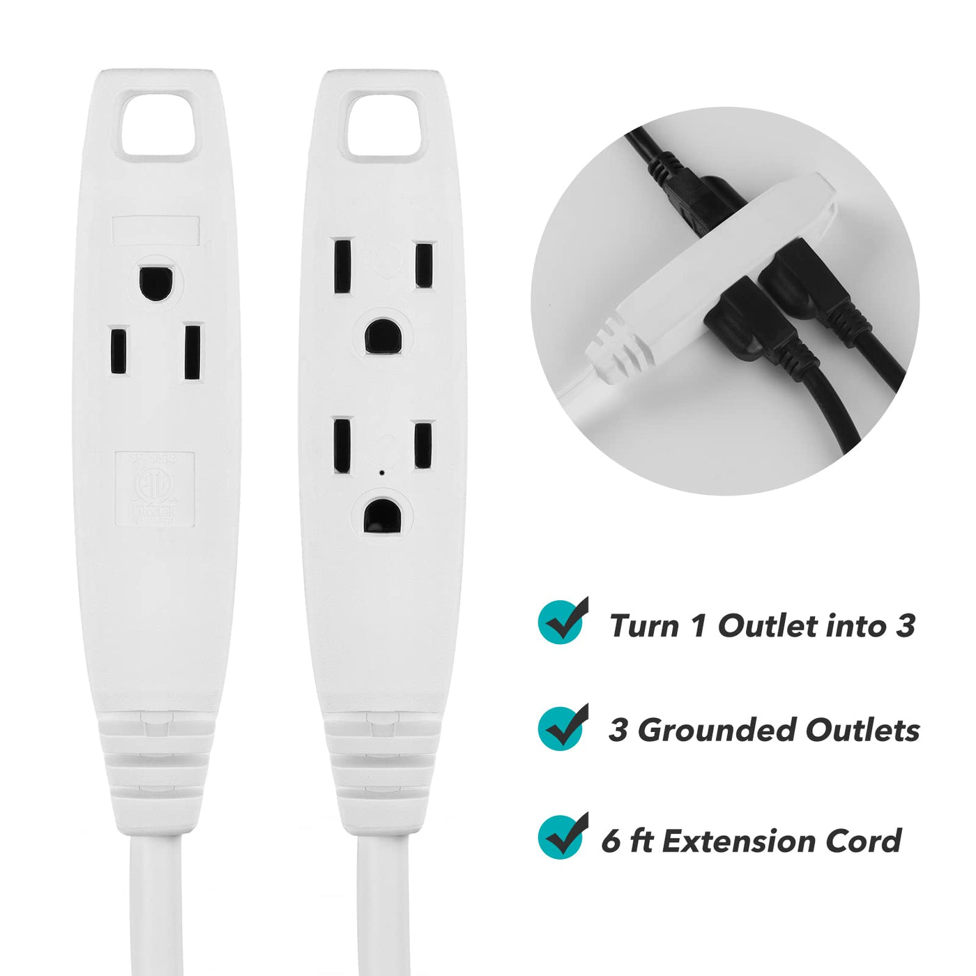 Clear Power 6 Ft 3 Outlet Heavy Duty Flat Plug Extension Cord 14/3 Sjt For Small Tools, Appliance And Office Equipment, White, 3 Prong Grounded, Dcic 0046 Dc