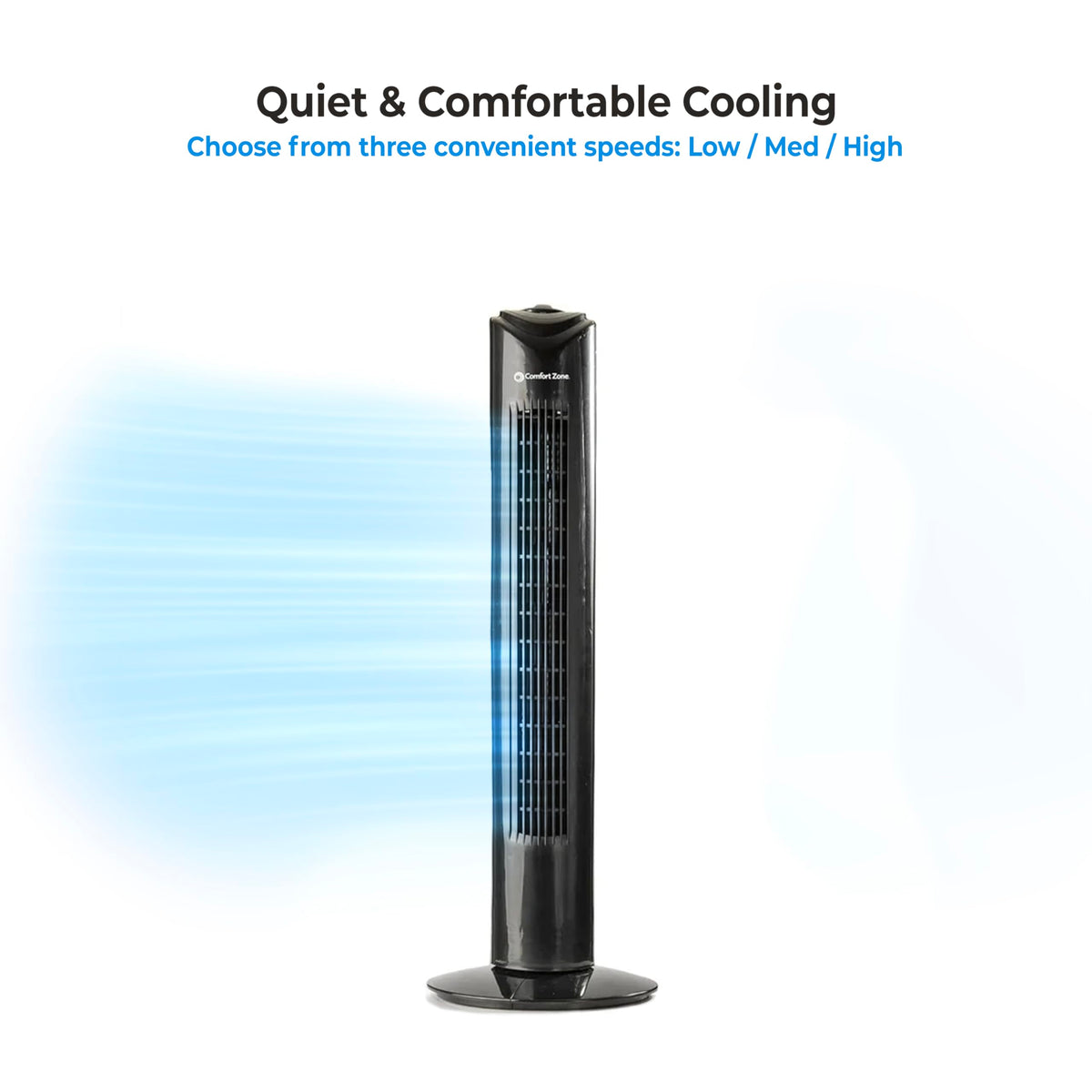 3-Speed Outputhelp Keep Air Moving At The Volume You Need To Keep Your Space Cool And Comfortable With This Comfort Zone Oscillating Tower Fan That Features A Choice Of Three Speeds To Provide You With Increased Control Over Airflow. With Its Three Speed Options, The Tower Fan Allows You To Select Low-, Medium- Or High-Velocity Output For Efficient Air Circulation That Suits Any Environment.Wide Area Coolingthis Tower Fan Features An Oscillating Function That Provides Wider Air Distribution, Giving You Improved Air Circulation Across Your Entire Space, So You Can Enjoy More Efficient Cooling Performance.Quiet Operationthe Comfort Zone Tower Fan Has Centrifugal Blades That Operate Quietly While Providing A Steady Flow Of Air, Ensuring That It Continues To Deliver Powerful Performance Without Disruptive Noise.Slim Profilethe Tower Fan Has A Modern Style And A Slim Profile For A Space-Saving Design. With The Built-In Carrying Handle, You Can Easily Move It To Anywhere You Want It.