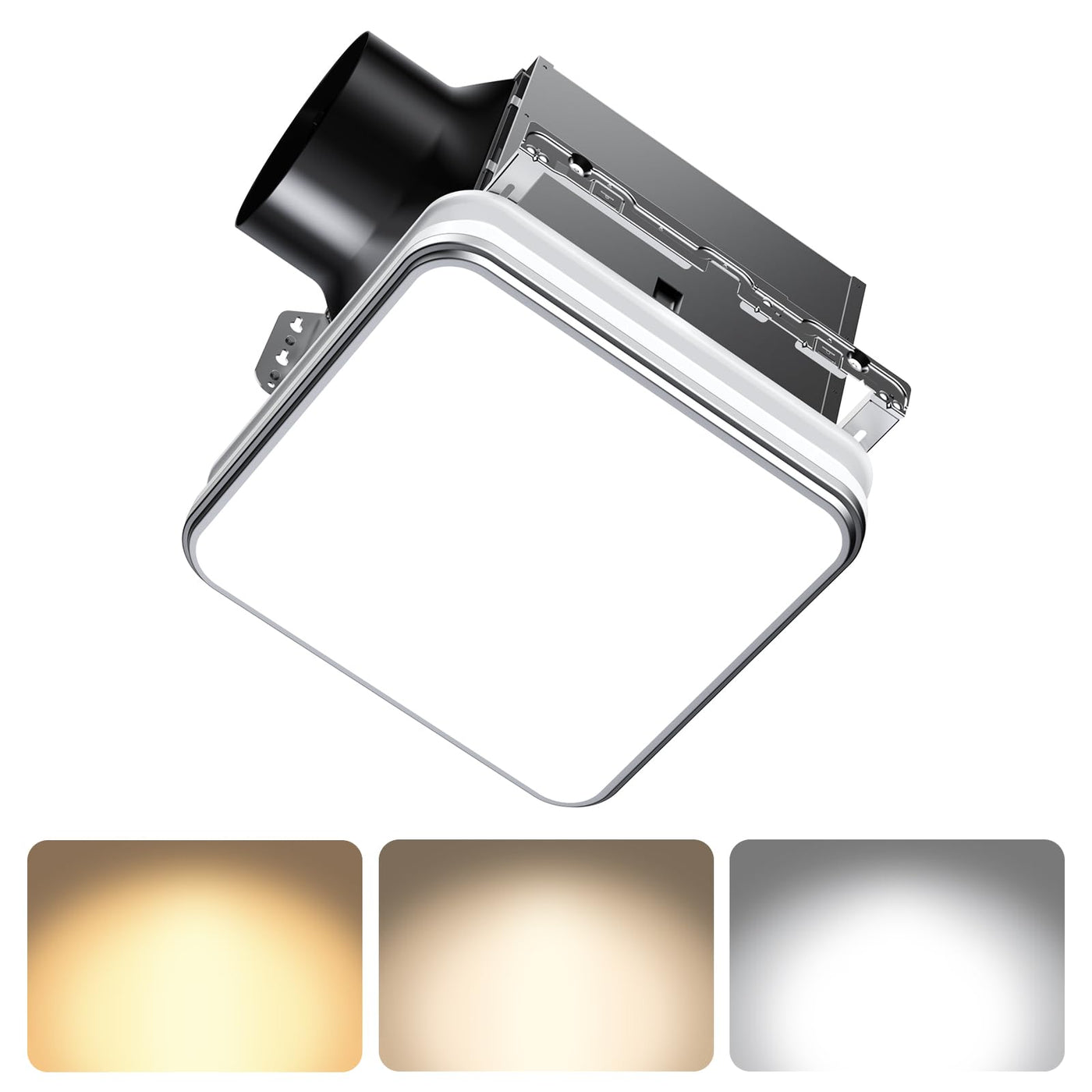 Q: What lighting options does the Consciot Bathroom Exhaust Fan provide?A: This fan features a powerful 1500lm LED light with three color temperature options (3000k, 4000k, 5000k) to create the desired ambiance in your bathroom. Additionally, it includes a built-in 200lm nightlight, making nighttime navigation easy. You can switch between light modes using your wall switch for convenience.