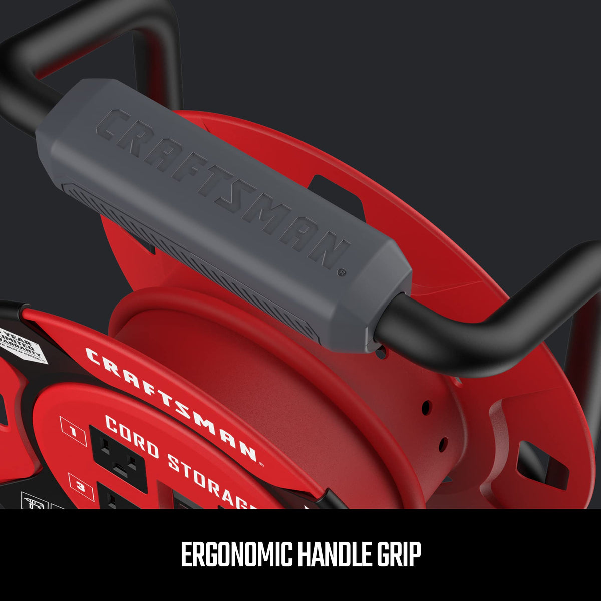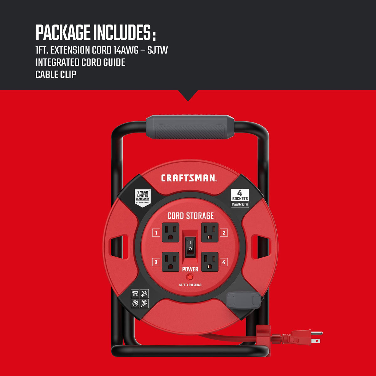 Power Where You Need It: Make Sure You Have Plenty Of Outlets While Working Outside With This Extension Cord Reel With 4 Outlets Craftsman! This 1Ft Cable Management Reel Is Csa Certified And Has An On/Off Switch And Light Indicator. | Convenient 4 Outlet Extension Cord: Always Have Outlets Where You Need Them With This Outside Retractable Power Cord Reel! This Roll-Up Extension Cord Includes 4 Grounded Outlets And A Durable 14Awg Cable To Provide Power To Outdoor Equipment | Tangle-Free Cord Management: This Retractable Cord Reel Features A Sturdy, Easy-Grip Handle So That You Can Easily Wind Your Extension Cords And Keep Everything Organized. It Also Includes An Auto-Locking System To Keep The End Of The Cord In Place. | Built-In Circuit Breaker: Designed To Protect Your Devices And Equipment, This Retractable Extension Cord Reel Includes A Built-In Circuit Breaker With Overload Protection. It Will Automatically Go Off If The Rated Current Or Voltage Is Exceeded. | Heavy-Duty Outdoor Power: With A Compact, Easy To Carry Design, This Electric Cord Reel Will Provide Outlets In Your Garden Or Backyard. This Extension Cord Wheel Is Ideal For Drills, Table Saws, Electric Lawn Mowers, Snowblowers, Or Power Washers. Rated For 13A/ 125V/ 1625W. Csa Certified.