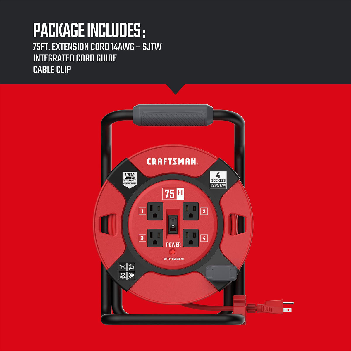Power Where You Need It: Make Sure You Have Plenty Of Outlets While Working Outside With This Extension Cord Reel With 4 Outlets Craftsman! This 75 Ft Electric Extension Cord Is Csa Certified And Has An On/Off Switch And Light Indicator. | Convenient 4 Outlet Extension Cord: Always Have Outlets Where You Need Them With This Outside Retractable Power Cord Reel! This Roll-Up Extension Cord Includes 4 Grounded Outlets And A Durable 14Awg Cable To Provide Power To Outdoor Equipment | Tangle-Free Cord Management: This Retractable Cord Reel Features A Sturdy, Easy-Grip Handle So That You Can Easily Wind Your Extension Cords And Keep Everything Organized. It Also Includes An Auto-Locking System To Keep The End Of The Cord In Place. | Built-In Circuit Breaker: Designed To Protect Your Devices And Equipment, This Retractable Extension Cord Reel Includes A Built-In Circuit Breaker With Overload Protection. It Will Automatically Go Off If The Rated Current Or Voltage Is Exceeded. | Heavy-Duty Outdoor Power: With A Compact, Easy To Carry Design, This Electric Cord Reel Will Provide Outlets In Your Garden Or Backyard. This Extension Cord Wheel Is Ideal For Drills, Table Saws, Electric Lawn Mowers, Snowblowers, Or Power Washers. Rated For 13A/ 125V/ 1625W. Csa Certified.