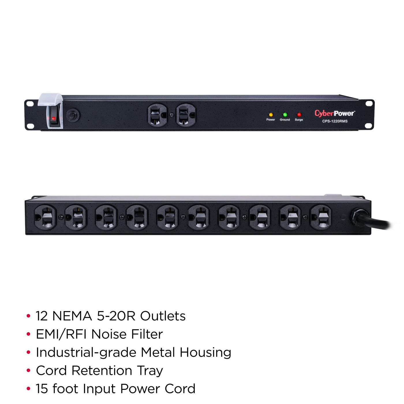 Engineered For The Most Demanding Applications, The Professional-Grade Rackbar Surge Protector Cps1220Rms From Cyberpower Safeguards Systems And Networking Equipment By Absorbing Spikes In Energy Caused By Storms And Electrical Power Surges. Designed For Network Environments, The Cps1220Rms Also Performs Superbly For Home Office Use, Providing 1800 Joules Of Protection, 20-Amp Electrical Capacity With Circuit Breaker, And 12 Surge-Protected Outlets (2 Front, 10 Rear). Industrial-Grade Metal Housing Keeps This Rackbar Performing Flawlessly. The Cps1220Rms Has A 1U Racksize And Can Be Mounted Vertically Or Horizontally. Features Of The Cps1220Rms Include An Emi/Rfi Noise Filter, Industrial-Grade Metal Housing, Ac Power Cord (15 Ft.). The Cps1220Rms Also Comes With A Three-Year Limited Warranty.