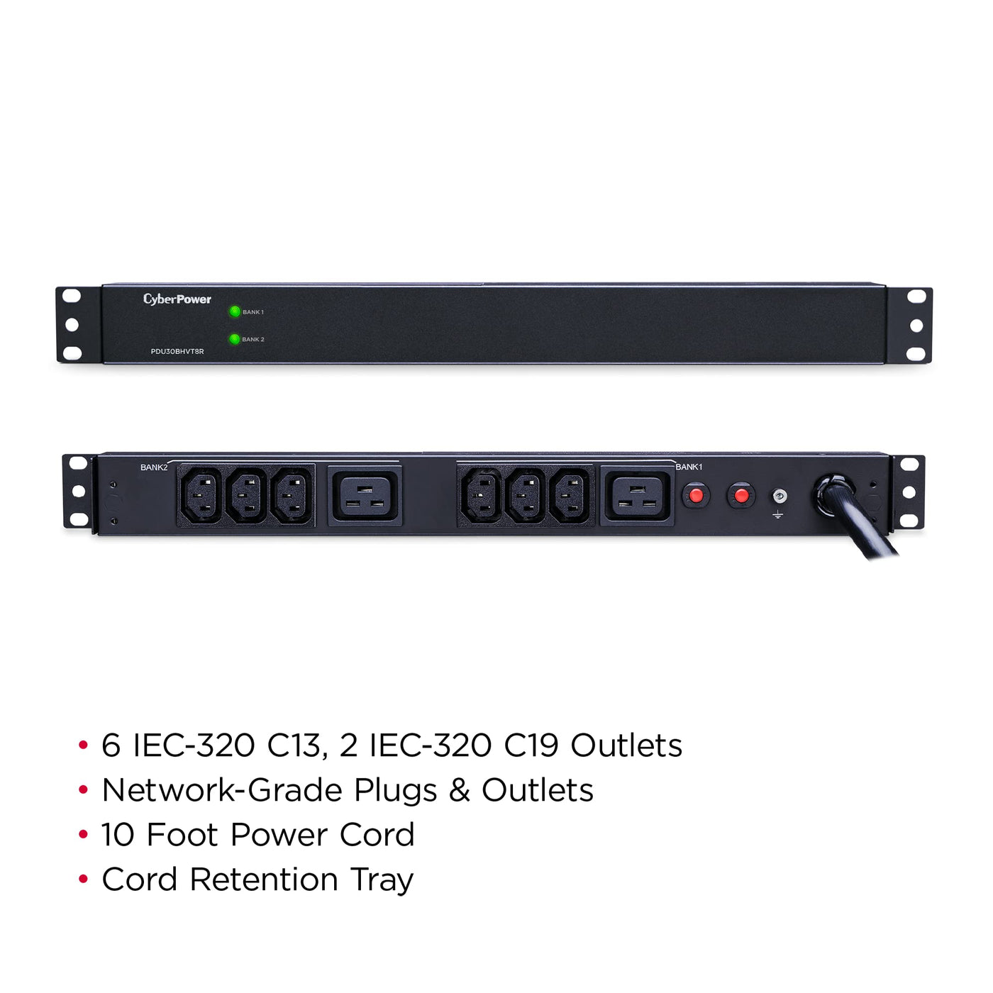 The Cyberpower Pdu30Bhvt8R, An 8-Outlet (Rear) Rackmount Basic Power Distribution Unit (Pdu), Provides 208V/230V 30A Output. It Distributes Power To 6 Iec-320 C13, 2 Iec-320 C19 Receptacles From A Single Nema L6-30P Twist Lock Plug With Unfiltered Electrical Pass-Through. Designed For Datacenters And Other Electrically Demanding Applications, The Pdu30Bhvt8R Has Rugged, Industrial-Grade Metal Housing And A 10-Foot Ac Power Cord. It Can Be Mounted Either Horizontally Or Vertically, Includes A Cord Retention Tray, And Is Etl/Rohs Certified. A Limited Lifetime Warranty Covers Defects In Materials And Workmanship In The Product Under Normal Use And Conditions.