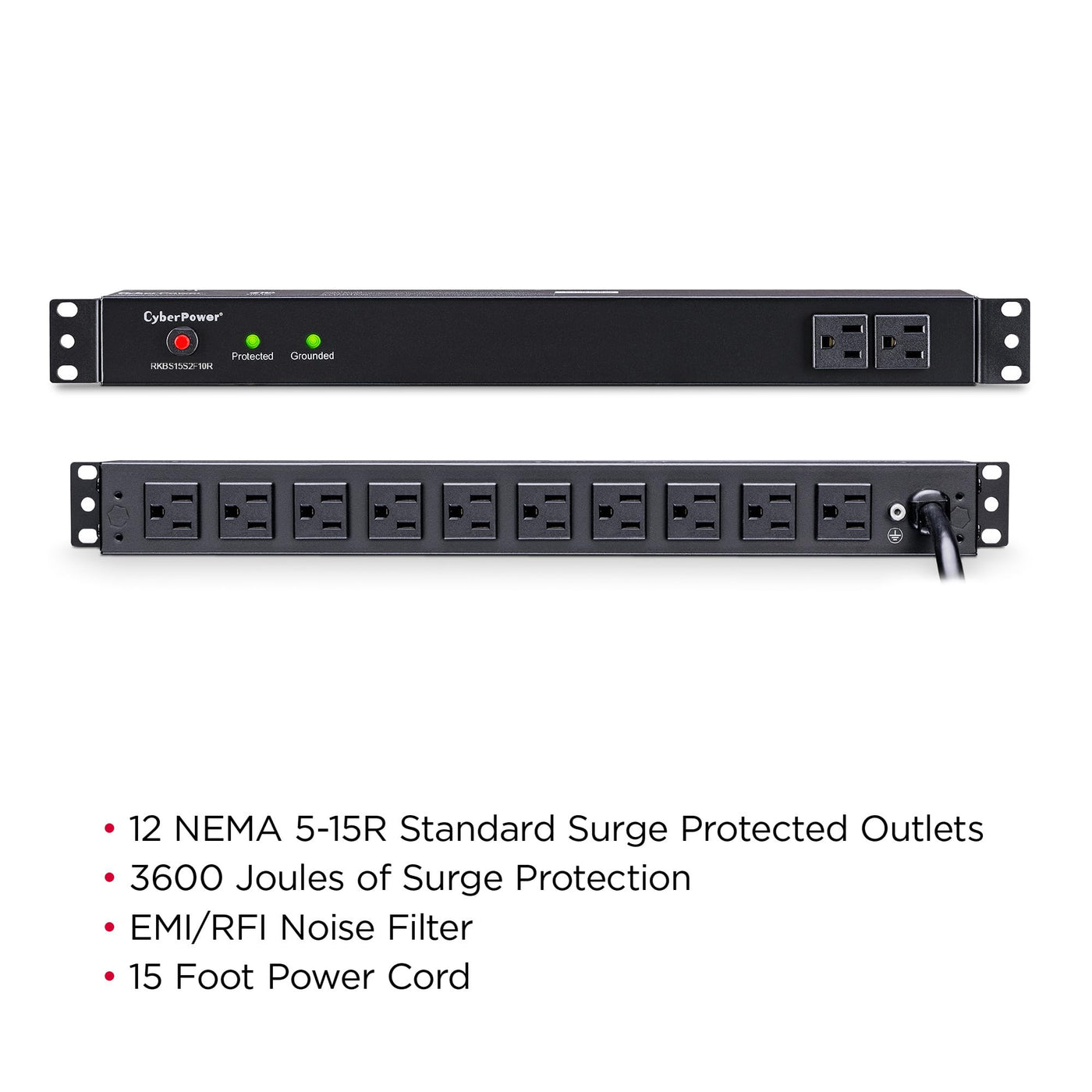 Engineered For The Most Demanding Applications, The Professional-Grade Rackbar Surge Protector Rkbs15S2F10R From Cyberpower Safeguards Systems And Networking Equipment By Absorbing Spikes In Energy Caused By Storms And Electrical Power Surges. Designed For Network Environments, The Rkbs15S2F10R Also Performs Superbly For Home Office Use, Providing 3600 Joules Of Protection, 15-Amp Electrical Capacity With Circuit Breaker, And 12 Surge-Protected Outlets (2 Front, 10 Rear). Industrial-Grade Metal Housing Keeps This Rackbar Performing Flawlessly. Two Sets Of Mounting Brackets Provide Flexible Installation Options: 1U Rackmount (19 In.); 0U Vertical Rackmount And Under-Counter Configurations. Features Of The Rkbs15S2F10R Include An Emi/Rfi Noise Filter, Led Status Indicators, Industrial-Grade Metal Housing, Ac Power Cord (15 Ft.), And A Cord Retention Tray. The Rkbs15S2F10R Also Comes With A Limited Lifetime Warranty And A Connected Equipment Guarantee.