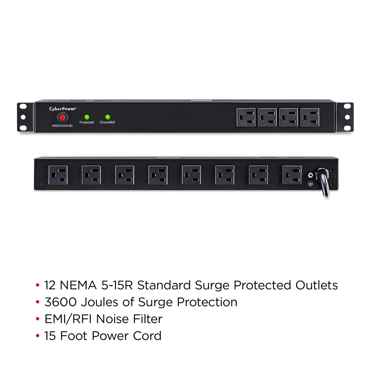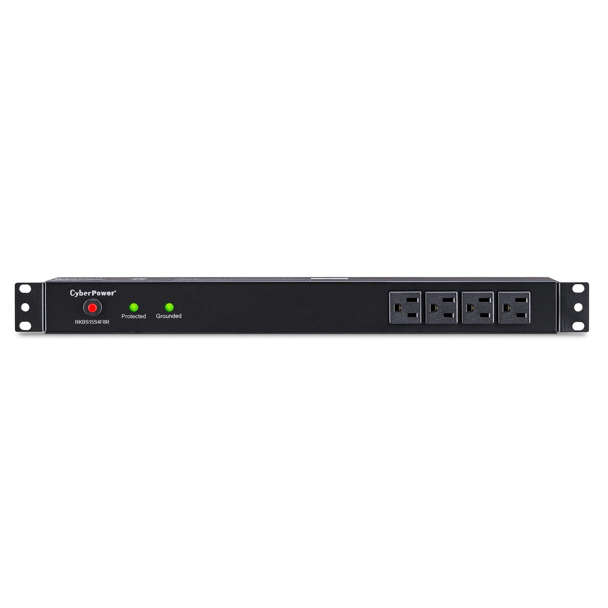 Q: How many outlets does the CyberPower RKBS15S4F8R have?A: This surge protector features a total of 12 NEMA 5-15R outlets, with 4 located at the front and 8 at the rear, allowing for versatile connectivity options.