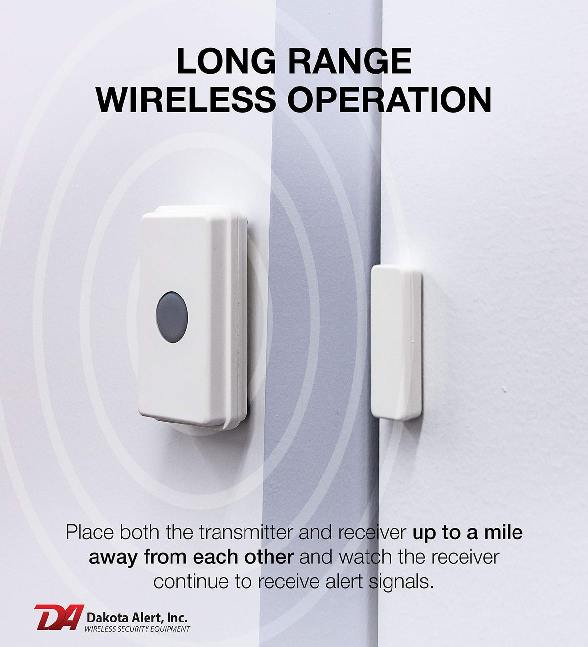 Dakota Alert Offers A Reliable One-Mile Range Wireless Doorbell Kit That Includes A Push Button, Panic Button, Magnetic Door Contact, And Universal Transmitter. With The Longest Wireless Range In Its Class, This System Ensures That The Radio Signal Is More Likely To Get Through To The Receiver. The Easy Installation Process Allows For Up To 16 Sensors To Be Paired With One Receiver, Making It Ideal For Homes, Warehouses, Retail Shops, Convenience Stores, Or Any Other Place Requiring A Long-Range Wireless Doorbell.