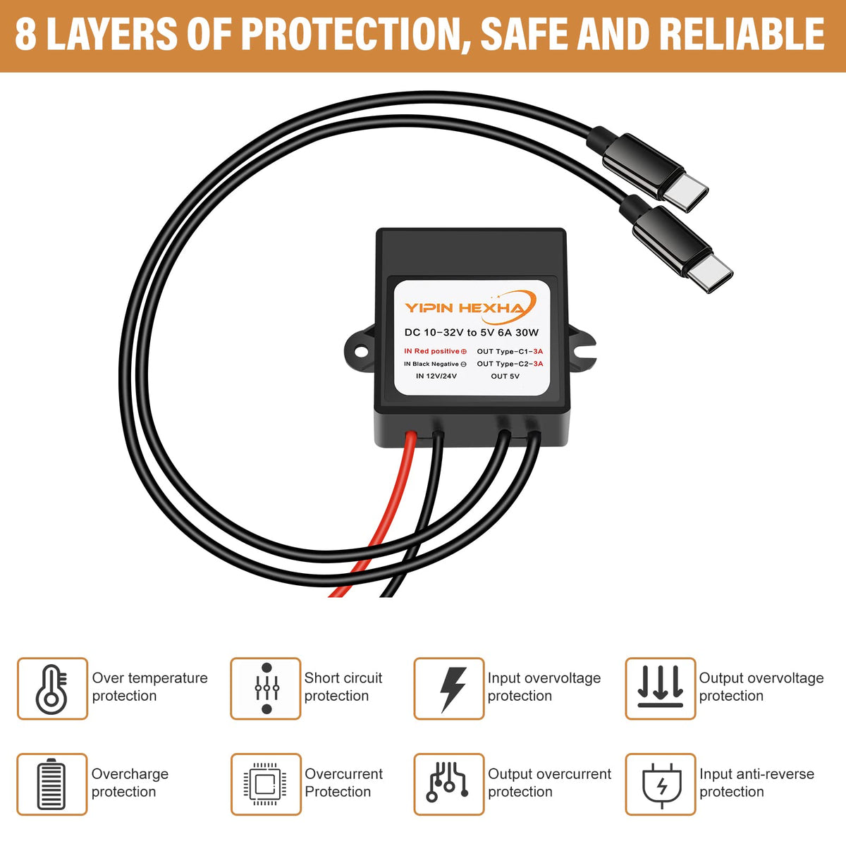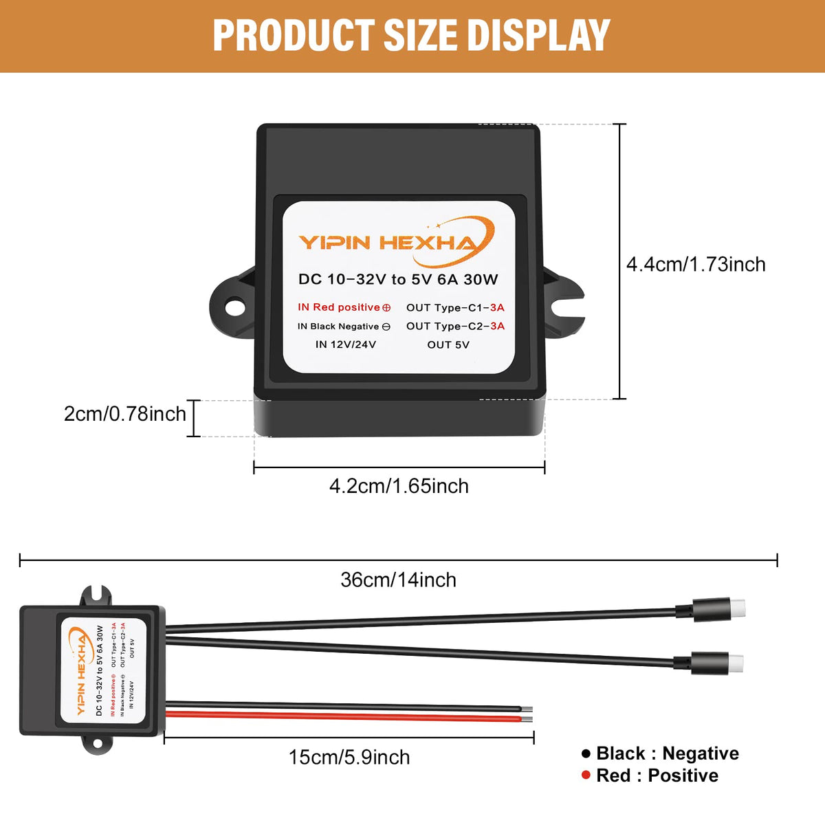 YIPIN HEXHA DC 12V/24V to 5V 6A 30W Dual Type-C USB C Converter Power Adapter - Black Step Down Charging Module