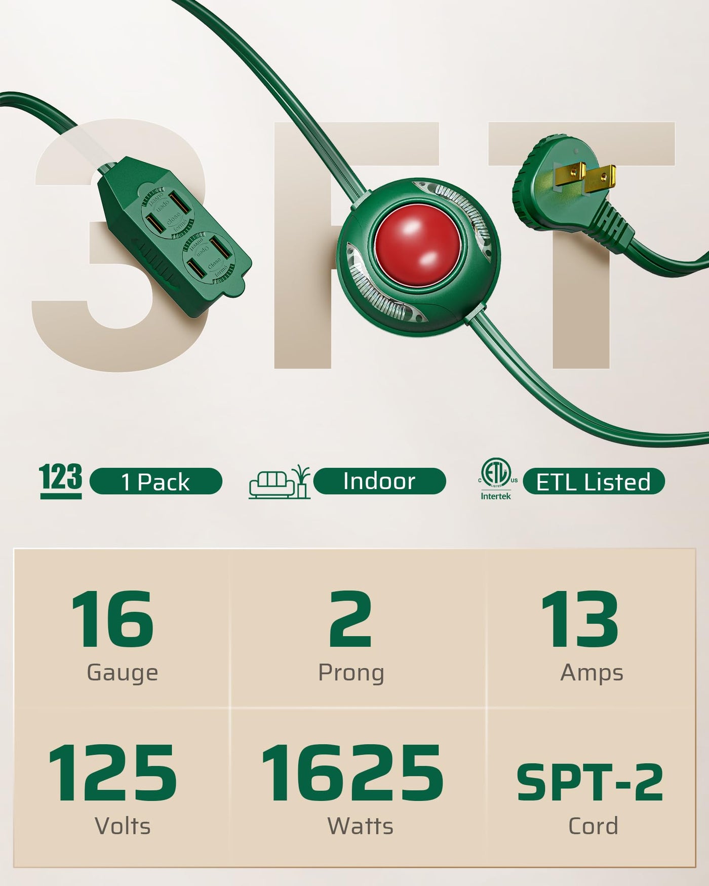 Q: What types of devices can I plug into the extension cord?A: The extension cord has 3 polarized outlets and is suitable for various devices such as floor lamps, holiday lights, and other household appliances that do not exceed the 13A/125V/1625W rating.