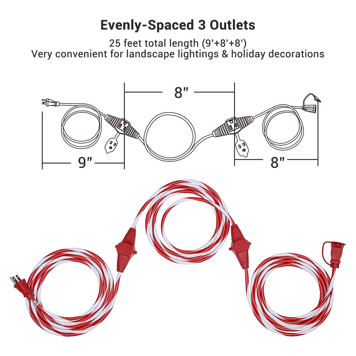 Q: How far apart are the outlets on the extension cord?A: The DEWENWILS 25FT Outdoor Extension Cord has three outlets that are evenly spaced 8 feet apart, allowing for convenient placement of multiple devices without excessive cord clutter.